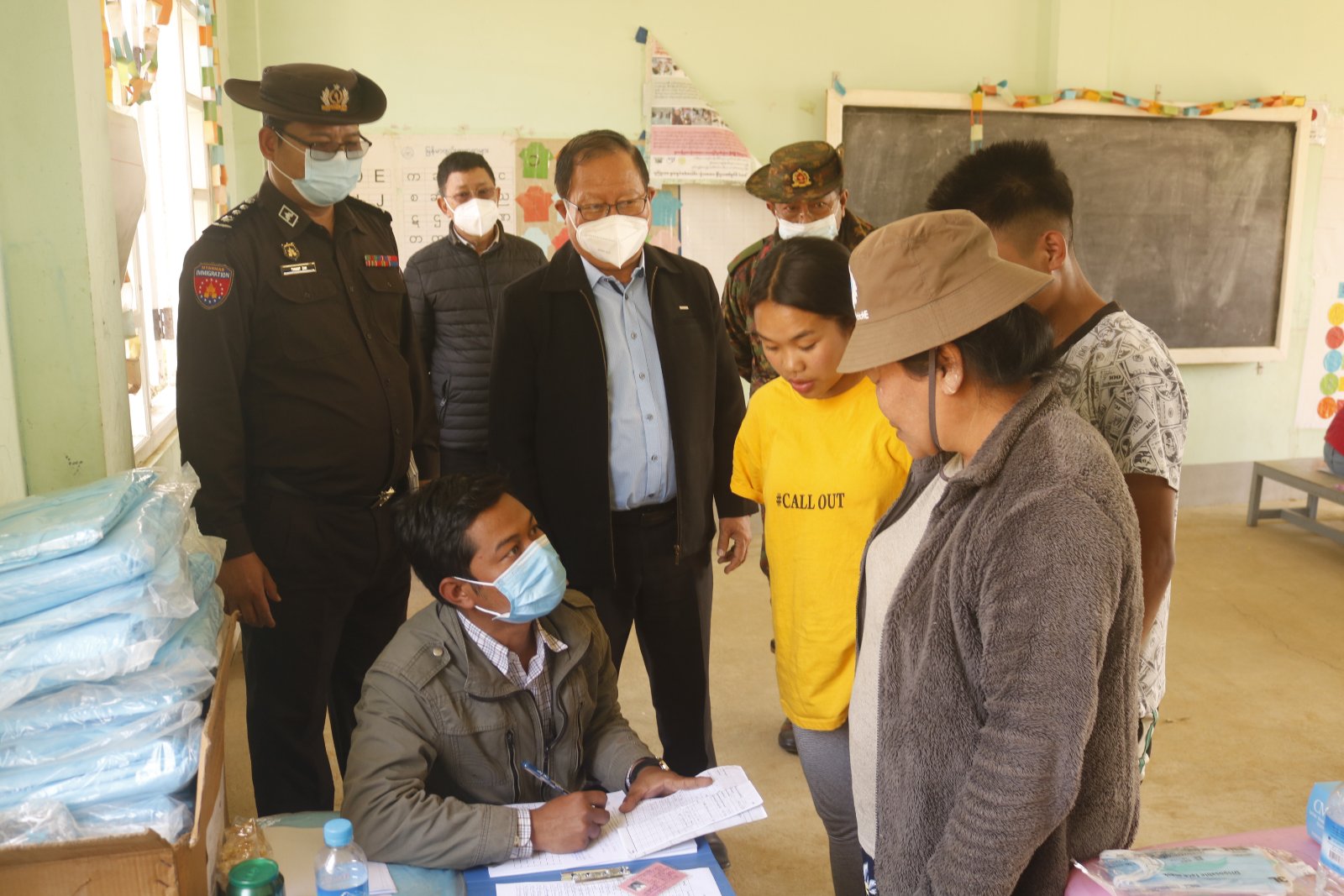ထိုသို့ သွားရောက်ကြည့်ရှုရာတွင် ပြည်နယ်ဝန်ကြီးချုပ်နှင့်အတူ အနောက်မြောက်တိုင်း စစ်ဌာနချုပ် ဒုတိယတိုင်းမှူး ဗိုလ်မှူးချုပ် မျိုးထွဋ်လှိုင်၊ ပြည်နယ်လူမှုရေးဝန်ကြီး ဦးသန့်ဇင်၊ လမ်းပန်းဆက်သွယ်ရေးဝန်ကြီး ရဲမှူးကြီး စိုးလွင်မိုး တို့က လိုက်ပါကြပြီး ပြည်နယ်ဝန်ကြီးချုပ်က လူဝင်မှုကြီးကြပ်ရေးနှင့် ပြည်သူ့အင်အားဦးစီးဌာနနှင့် တာဝန်ရှိသူများက ပြည်သူများအား နိုင်ငံသားစိစစ်ရေးကတ်ပြားနှင့် လဝက ပုံစံ ၆၆/၆ ပြုလုပ်ပေးနေမှု အခြေအနေကို ကြည့်ရှု အားပေးပြီး ပြည်သူများအား နိုင်ငံသားစိစစ်ရေးကတ်ပြားနှင့် အိမ်ထောင်စု စာရင်းပိုင်ဆိုင်ရခြင်း၏ အကျိုးကျေးဇူးများကို ရင်းရင်းနှီးနှီးရှင်းပြကာ ပန်းခင်းစီမံချက်တွင် ပါဝင်သည့် တာဝန်ရှိသူ များအား ထောက်ပံ့ငွေပေးအပ်သည်။