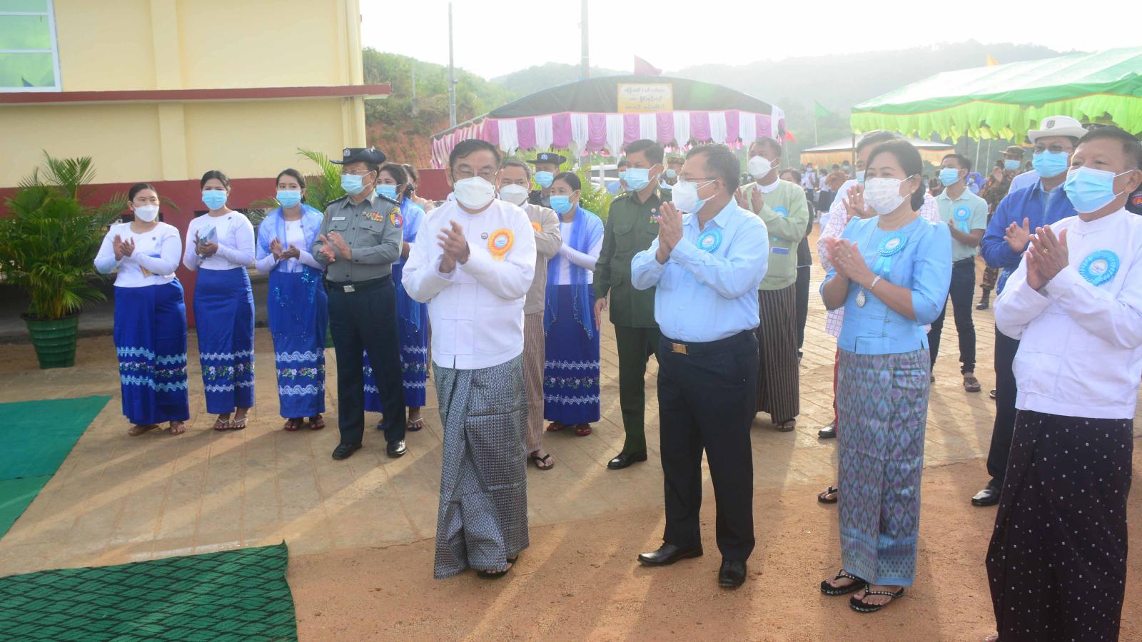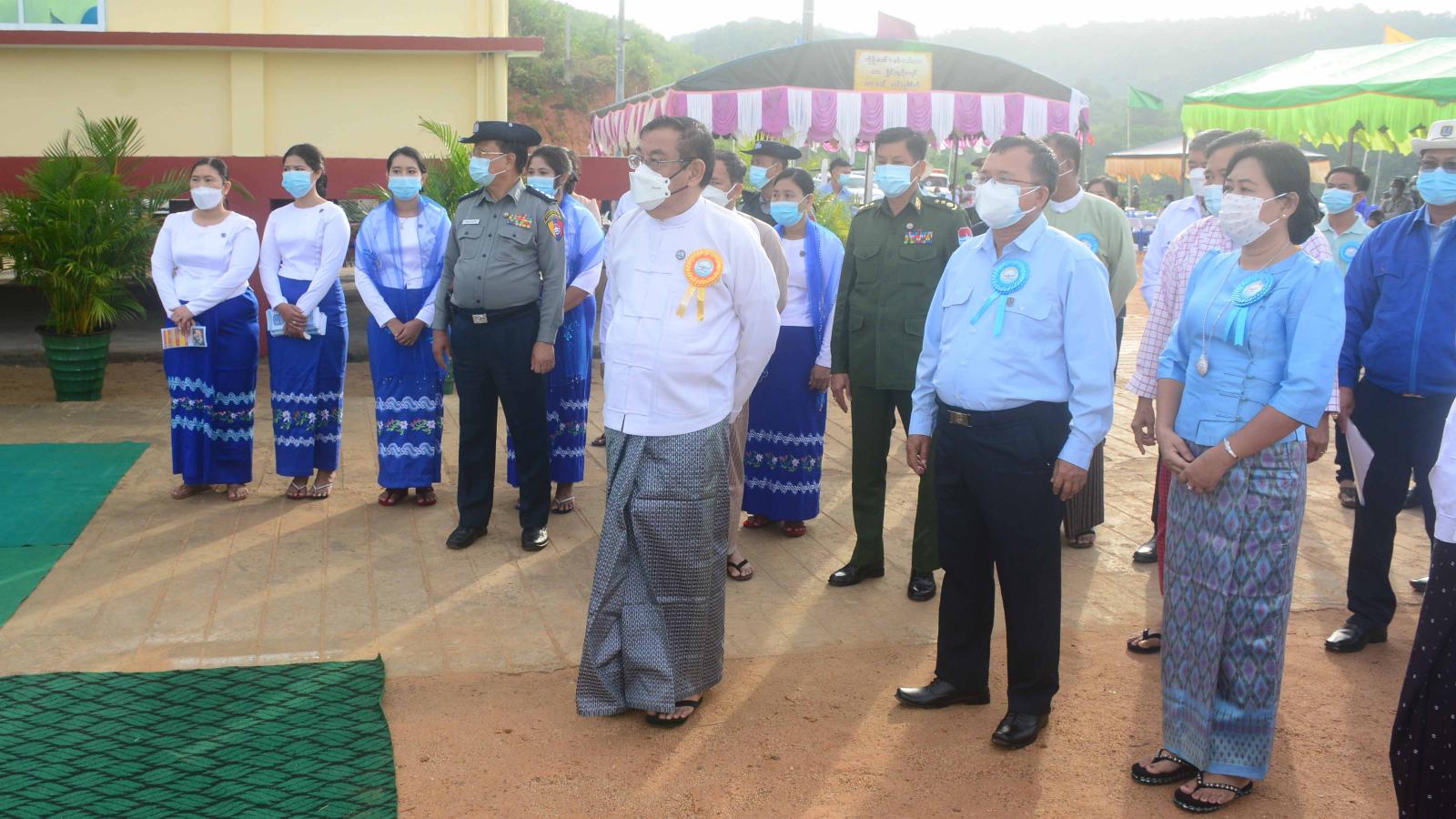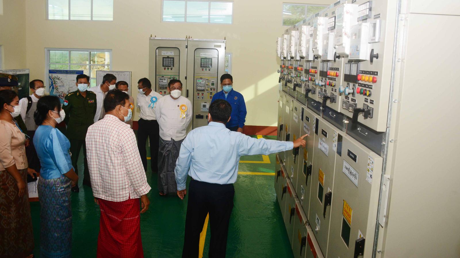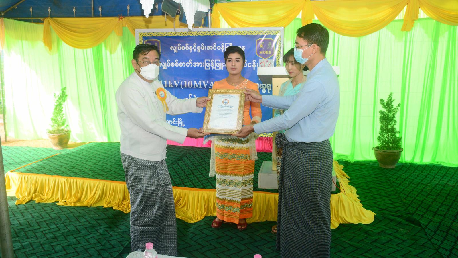 ဆက်လက်၍ တိုင်းဒေသကြီးဝန်ကြီးချုပ်ဦးမြတ်ကိုက တည်ဆောက်ရေးကုမ္ပဏီများအား ဂုဏ်ပြု မှတ်တမ်းလွှာပေးအပ်ပြီး ဓာတ်အားခွဲရုံအား လှည့်လည်ကြည့်ရှုစစ်ဆေးသည်။