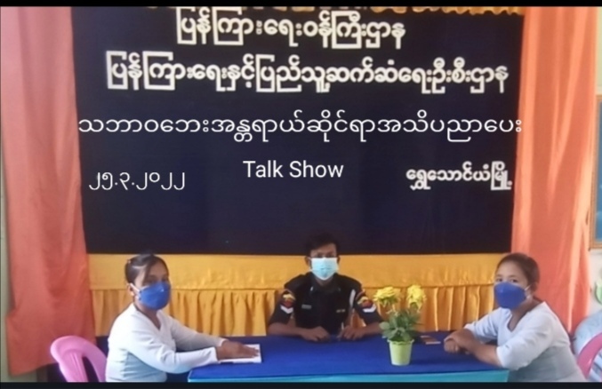 သဘာဝဘေးအန္တရယ်ဆိုင်ရာ (Talk Show) ဆောင်ရွက်ရာတွင် ရှေးဦးစွာ ပြန်ကြားရေးနှင့်ပြည်သူ့ဆက်ဆံရေးဦးစီးဌာန၊ ဦးစီးမှူး ဒေါ်ခင်ဝေဝေမြင့်မှ သဘာဝဘေးအန္တရာယ်ဆိုင်ရာ အသိပညာပေး လုပ်ငန်းများနှင့်စပ်လျင်း၍ မေးမြန်းရာ ရွှေသောင်ယံနယ်မြေ မီးသတ်စခန်းမှ တပ်ကြပ်ဇော်ဇင်မိုးမှ မီးသတ်တပ်ဖွဲ့ဝင်များအနေဖြင့် သန္ဓေအင်အား (၄)ဦး၊ အရန်အင်အား (၂၀)ဦးတို့မှ အသင့်အနေအထားဖြင့် ပြင်ဆင်ဆောင်ရွက်ထားကြောင်း၊ သဘာဝဘေးအန္တရာယ်ဆိုင်ရာ သတင်းများကိုလည်း အချိန်နှင့်တစ်ပြေးညီ သိရှိနိုင်အောင် စီးမံထားပြီး လိုက်လံဆော်ဩသွားမှာဖြစ်ကြောင်း၊ သဘာဝဘေးအန္တရာယ် ကာကွယ်ရေးအတွက် ကြိုတင်ကာကွယ်မှုများအနေဖြင့် မဖြစ်ခင်၊ ဖြစ်နေစဉ်၊ ဖြစ်ပြီးအချိန်တို့တွင် မည်သို့လုပ်ဆောင်ရမည်ကို ကြိုတင်စီစဉ်ထားကြောင်း စသည်ဖြင့် ပြောကြားခဲ့သည်။