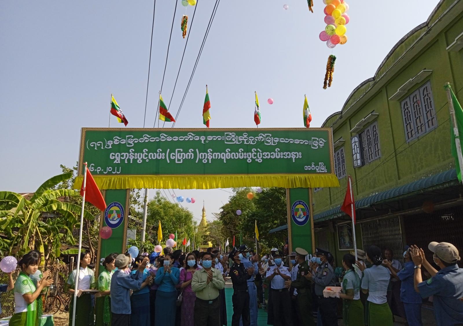 အခမ်းအနားတွင် မြို့နယ်စီမံအုပ် ချုပ်ရေးအဖွဲ့ဥက္ကဋ္ဌ ဦးအောင်ကျော်မိုးမှ အဖွင့်အမှာစကားပြောကြားခဲ့ပြီး မြို့နယ်စည်ပင်သာယာ ရေးအဖွဲ့မှ အင်ဂျင်နီယာမှူးဦးမျိုး ချစ်ဦးကလမ်းနှင့် ပတ်သက်သော အခက်အချက်များကို ရှင်းလင်းတင်ပြခဲ့သည်။ ထို့နောက် ရပ်မိရပ်ဖတစ်ဦးမှ ကျေးဇူးတင်စကားပြေားခဲ့ပြီး ကွန်ကရစ်လမ်းသစ်အား မြို့နယ်စီမံအုပ်ချုပ်ရေးအဖွဲ့ ဥက္ကဋ္ဌ ဦးအောင်ကျော်မိုး၊ မြို့နယ်စည်ပင်သာယာ ရေးကော်မတီ ဥက္ကဋ္ဌဦးမောင်ဝင်း နှင့်မြို့နယ် စည်ပင်သာယာရေးအဖွဲ့အမှုဆောင်အရာရှိဦး နေမျိုးလင်းတို့မှဖဲကြိုးဖြတ်ဖွင့်လှစ်ပေးခဲ့သည်။ထို့နောက် အထိမ်းအမှတ် အလံများကို ဂုဏ်ကြီးရှင်ကုမ္ပဏီမှ တာဝန်ရှိသူတစ်ဦးကပေးအပ်ရာ မြို့နယ်စီမံအုပ်ချုပ်ရေးအဖွဲ့ ဥက္ကဋ္ဌ နှင့်တာဝန်ရှိသူများမှ လက်ခံရယူခဲ့သည်။