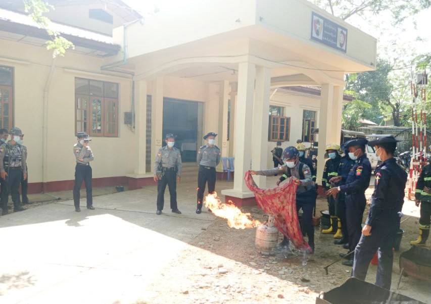 ထိုသို့ဆောင်ရွက်ရာတွင်ခရိုင်ရဲတပ်ဖွဲ့မှူးဦးဆောင်၍ မြို့နယ်မီးသတ်ဦးစီဌာန၊ မြို့နယ်ရဲတပ်ဖွဲ့ တို့ ပူးပေါင်း၍ မြို့နယ်မီးသတ်ဦးစီးဌာန ဦးစီးမှူး ဦးဇော်လွင်ဦးနှင့် တာဝန်ရှိသူများမှ သွားရောက်ပြီး ရဲစခန်းများအတွင်းရှိ ရဲတပ်ဖွဲ့ဝင်များနှင့် နေအိမ်လိုင်းခန်းများတွင် နေထိုင်ကြ သော တပ်ဖွဲ့ဝင် မိသားစုများအနေဖြင့် မီးဘေးအန္တရာယ် မဖြစ်ပွားစေရေးနှင့် မီးဘေးကြောင့် အသက်အိုးအိမ် စည်းစိမ်များ ဆုံးရှုံးမှုမရှိစေရေးအတွက် မီးကိုစနစ်တကျ အသုံးပြုစေရေး၊ လျှပ်စစ်မီးအသုံးပြုသူများ အနေဖြင့် မိမိတို့နေအိမ်များရှိ လျှပ်စစ်ဝါယာကြိုးများ ပေါက်ပြဲမှုရှိ မရှိ၊ လျှပ်စစ်ဝါယာကြိုးများ၊ မီးပလက်ပေါက်များ ဟောင်းနွမ်းနေပါကလည်း သက်ဆိုင်ရာ လျှပ်စစ်ဝန်ထမ်းများဖြင့် လဲလှယ်တပ်ဆင် အသုံးပြုစေရေး၊ ထင်းမီးဖိုဖြင့် ထမင်း၊ ဟင်းချက် ပြုတ်သူများ အနေဖြင့် မီးကြွင်း၊ မီးကျန်များကို စနစ်တကျ မီးငြိမ်းသတ်စေရန်နှင့် နေအိမ်လိုင်း ခန်းများတွင်လည်း မီးသတ်ဆေးဘူး၊ မီးသတ် ရေပုံများ၊ မီးချိတ်၊ မီးကပ်များ၊ သဲအိတ်များ၊ ရေကန်များ၌ ရေများဖြည့်တင်းကာ အသင့်ထားရှိရန်နှင့် မီးငြိမ်းသတ်မှု သရုပ်ပြခြင်း၊ မီးသတ်ဆေးဘူးဖြင့် မီးငြှိမ်းသတ်မှု သရုပ်ပြခြင်းတို့ကို ဆောင်ရွက်ခဲ့ ကြကြောင်း သိရသည်။
