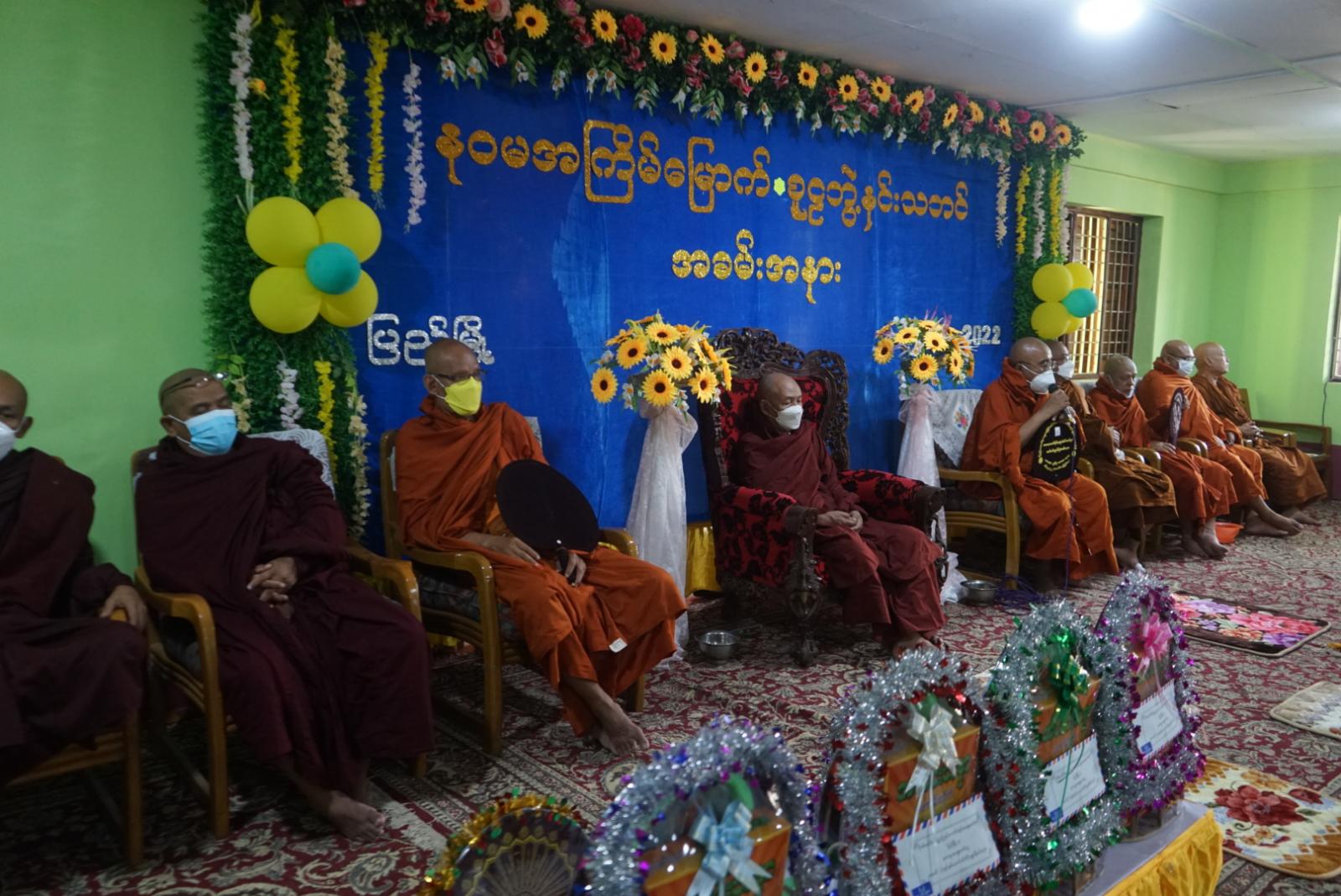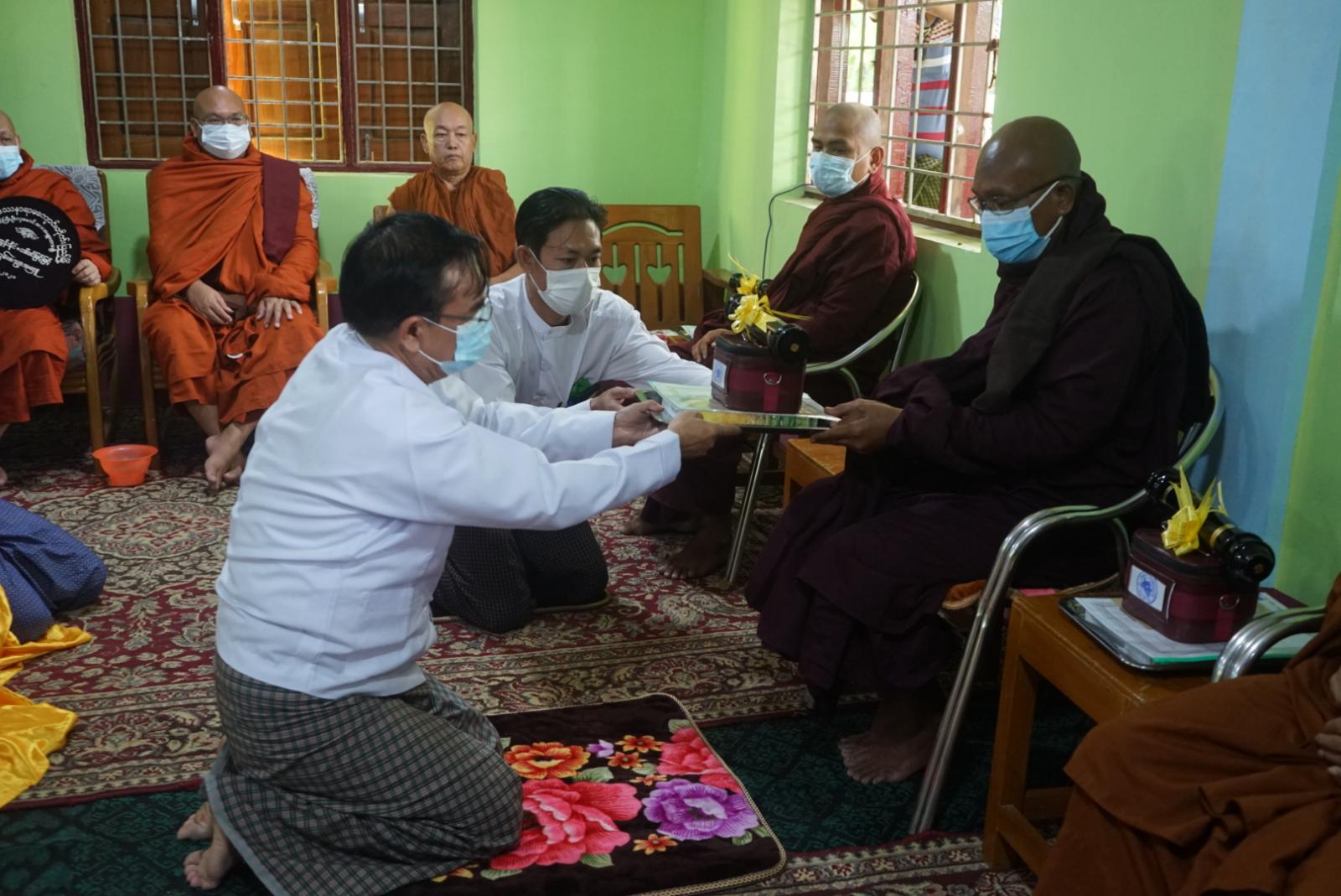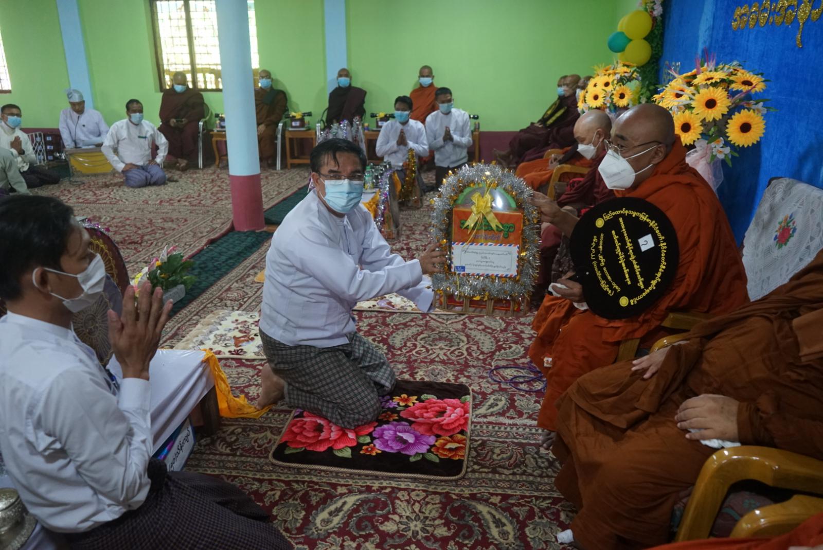 ထို့နောက်တိုင်း ဒေသကြီးဝန်ကြီးချုပ်နှင့်အဖွဲ့က အကြည်ညိုခံဆရာတော်ကြီးများထံ လှူဖွယ်ဝထ္ထုပစ္စည်းများဆက်ကပ်လှူဒါန်းသည်။ ဆက်လက်၍ တိုင်းဒေသကြီးအစိုးရအဖွဲ့ဝန်ကြီးချုပ်၊ နယ်စပ်ရေးရာနှင့်လုံခြုံရေးဝန်ကြီး၊ တိုင်းဒေသကြီးတရားသူကြီးချုပ်၊ ဥပဒေချုပ်နှင့် ဒေသကွက် ကဲရေးမှူး(ပြည်)တို့က ဓမ္မစရိယစာအောင်သံဃာတော်များနှင့်သီလရှင်များထံ အောင်လက်မှတ်နှင့်ဆုဝထ္ထုငွေများပေးအပ်လူဒါန်းရာဝင်္ဂဘာတောရစာသင်တိုက်ဦးစီးပဒါနနာယကဆရာတော်အရှင်သူမြတ်က လှူဒါန်းမှုအစုစုအတွက် ရေစက်သွန်းချအမျှပေးဝေသည်။ ယင်းနောက် ဆရာတော်ကြီးများအမှူးပြုသော ဧည့်ပရိသတ်အပေါင်းတို့က ဗုဒ္ဓသာသနံစိရံတိဌတုသုံးကြိမ် ရွတ်ဆိုဆုတောင်း၍ အခမ်းအနားပထမပိုင်းအစီအစဉ်ပြီးမြောက်ခဲ့သည်။