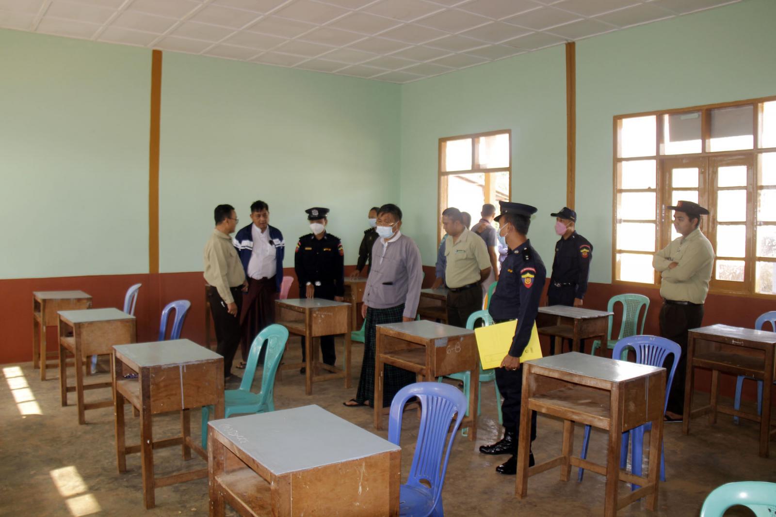 မြို့နယ်စီမံအုပ်ချုပ်ရေးအဖွဲ့ဥက္ကဋ္ဌ ဦးကျော်မိုးနှင့် အဖွဲ့ဝင်များ၊ မြို့နယ်ရဲတပ်ဖွဲ့မှူး ရဲမှူး ကျော်နိုင်စိုး၊မြို့နယ်စည်ပင်သာယာရေး အမှုဆောင်အရာရှိ ဦးအောင်နိုင်ဦး၊ မြို့နယ်မီးသတ်ဦးစီးမှူး ဦးမျိုးမြင့်အောင်၊ မြို့နယ်လျှပ်စစ်အင်ဂျင်နီယာ ဦးမျိုးမြင့်သန်း၊ မြို့နယ်ပညာရေးမှူး ဦးမြင့်လွင်နှင့် ရပ်ကွက်အုပ်ချုပ်ရေးမှူးများက စာစစ်ဌာနအတွင်းရှိ စာဖြေအဆောင်များနှင့် အခန်းများ အလိုက် မီးဘေးလုံခြုံရေးစစ်ဆေးပေးခြင်း၊ မီးသတ်ဆေးဗူးများစစ်ဆေးခြင်း၊ လျှပ်စစ်မီးသွယ်တန်းထားမှု အခြေအနေများ စစ်ဆေးခြင်းနှင့် ကျောင်းသား၊ ကျောင်းသူများ အဆင်ပြေချောမွေ့စွာ စာမေးပွဲဖြေဆိုနိုင်ရေးအတွက် ဆောင်ရွက်ထားရှိမှု အခြေအနေများကို စစ်ဆေးခဲ့ကြပြီး လိုအပ်သည်များကို သက်ဆိုင်ရာတာဝန်ရှိသူများက ဆောင်ရွက်ပေးခဲ့ကြောင်းသိရသည်။