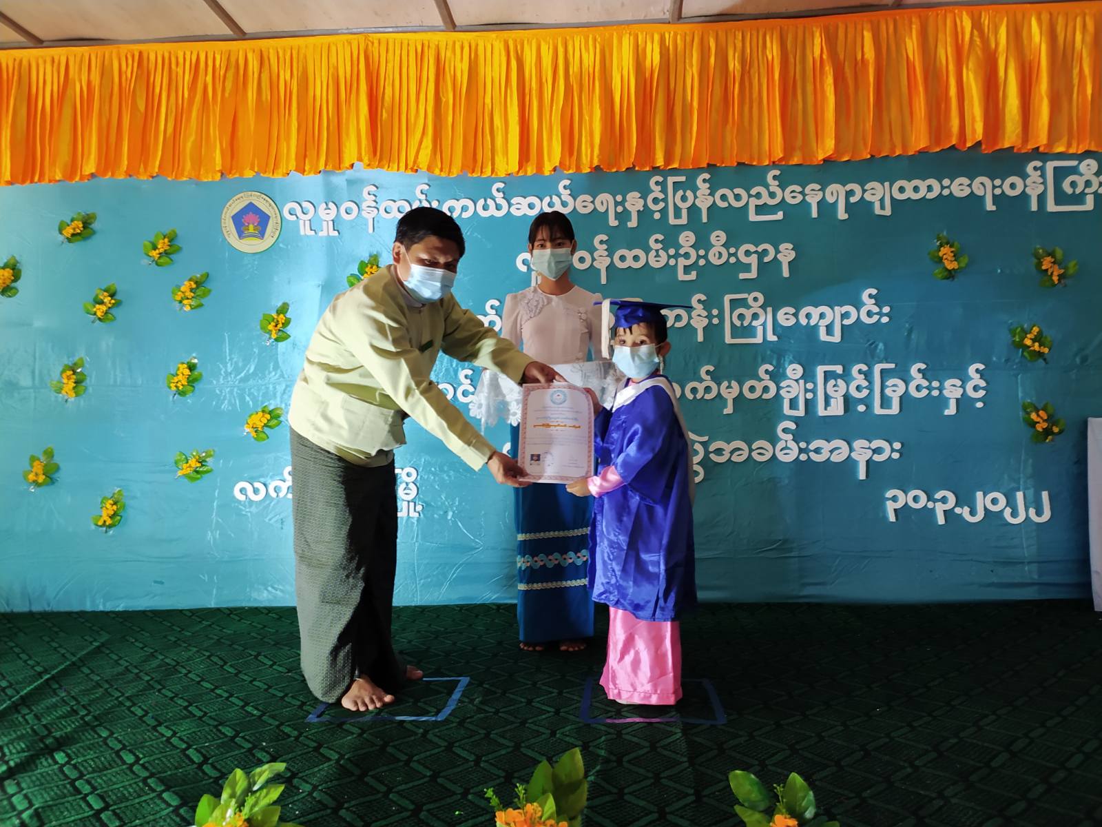 ဆက်လက်၍ မူလတန်း ကျောင်းသား/ ကျောင်းသူများ မြို့နယ်စီမံအုပ်ချုပ်ရေးအဖွဲ့ဥက္ကဋ္ဌနှင့် တာဝန်ရှိသူများက ကျောင်းဆင်း လက်မှတ်များကို အသီးသီးပေးအပ်ခဲ့ကြသည်။