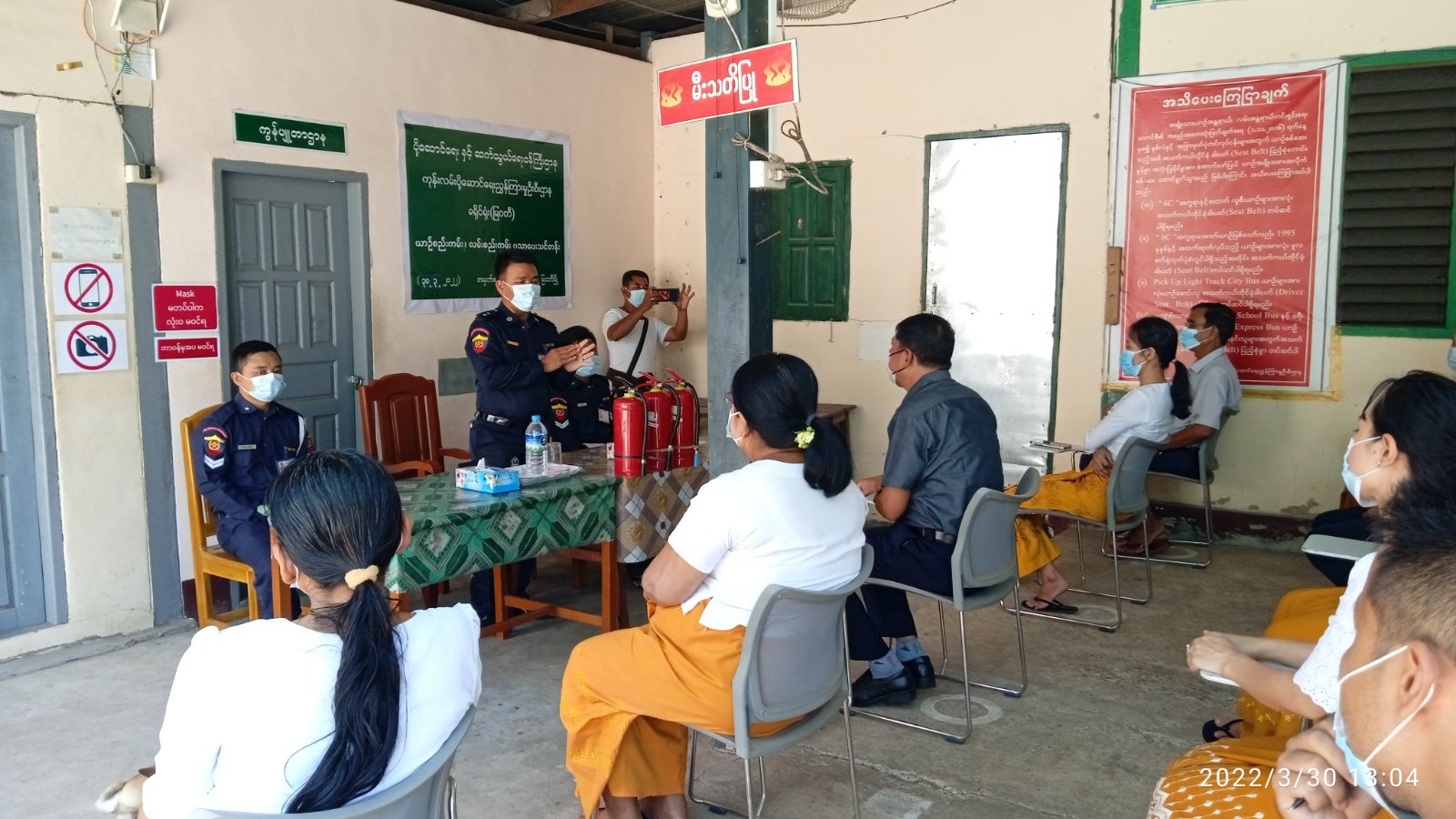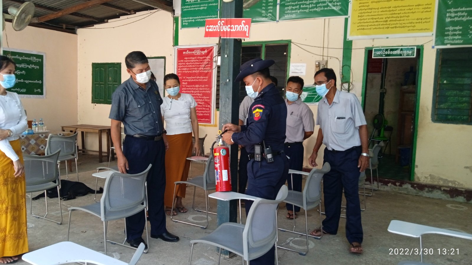 ဆက်လက်၍ ခရိုင်မီးသတ်ဦးစီးဌာနရုံးမှ ဒုတိယဦးစီးမှူးဦးကျော်မင်းသန်းဦးဆောင်၍ မီးသတ်တပ် ဖွဲ့ဝင် (၃)ဦးက ခရိုင်ကုန်းလမ်းပို့ဆောင်ရေးနှင့်ညွှန်ကြားမှုဦးစီးဌာနရုံးအတွင်းရှိ မီးသတ်ဆေးဗူး ထာရှိမှုနှင့်မီးချိတ်၊ မီးကပ်များ ထားရှိမှုအခြေအနေများကို လိုက်လံစစ်ဆေး အကြံပြုပေးခဲ့ရာ မီးသတ်ဆေးဗူးဖြင့် မီးငြှိမ်းသတ်နည်းများကိုလည်း လက်တွေ့ သရုပ်ပြခဲ့ကြောင်း သိရသည်။