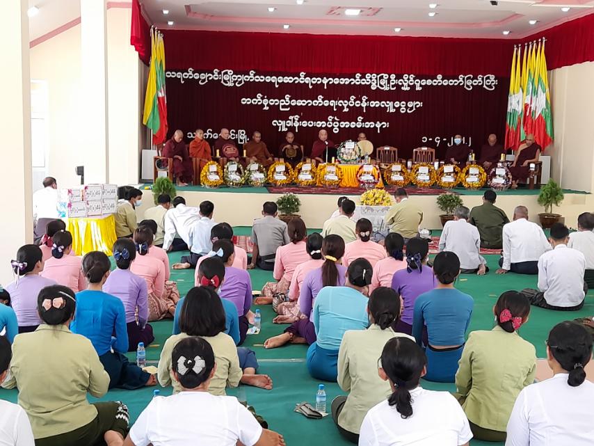 အခမ်းအနားသို့ မြို့နယ်သံဃာနာယကအဖွဲ့ဥက္ကဋ္ဌမှ ဦးစီးသော သံဃာတော်အရှင်သူမြတ် (၁၀) ပါး ကြွရောက်ချီးမြှင့်ပေးတော်မူပြီး ရှေးဦးစွာ ဆရာတော်သံဃာတော်ရှင်မြတ်များနှင့် ဧည့်ပရိတ်သတ်တို့က နမောတဿ (၃) ကြိမ်ရွတ်ဆိုကာ ငါးပါးသီလခံယူတည်ဆောက်ခဲ့ပြီး ပရိတ်ကြီး(၁၁)သုတ်ထဲမှ ရတနာသုတ်၊ မေတ္တာသုတ်၊ ဓာရဏပရိတ်မဟာသမာယသုတ်၊ ကမ္မဝါစာတရားတော်အရှင်မြတ်များကရွတ်ဖတ်ချီးမြှင့်ခဲ့ကြသည်။