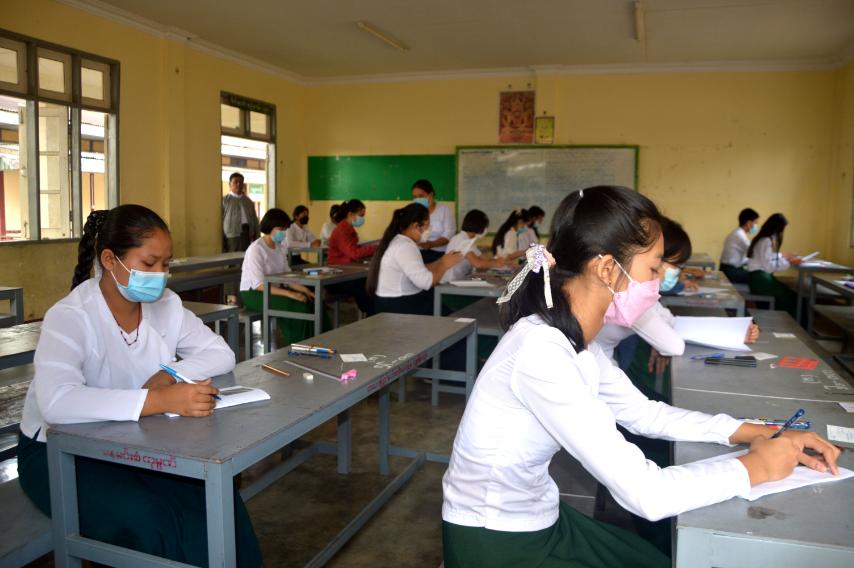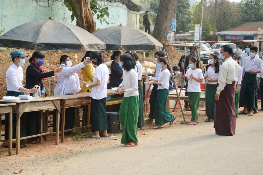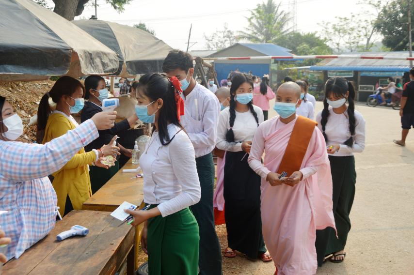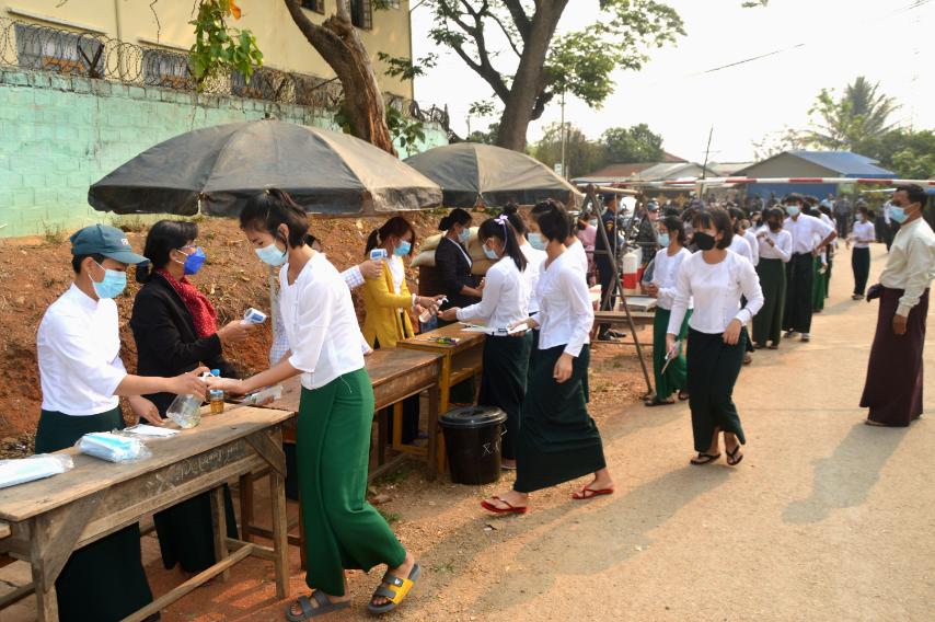 စာမေးပွဲဖြေဆိုခြင်းမပြုမီ ကိုဗစ်-၁၉ ရောဂါဆိုင်ရာစည်းမျဉ်း /စည်းကမ်းများနှင့်အညီ နှာခေါင်း စည်းများတပ်ဆင်စေခြင်း၊ ကိုယ်အပူချိန်တိုင်းတာပေးခြင်း၊ စာမေးပွဲဖြေဆိုခွင့်ကဒ်များ မှန်/မမှန် စစ်ဆေးခြင်းများကို ဆရာ/ဆရာမများက စနစ်တကျစစ်ဆေးခြင်းများ ကိုဆောင်ရွက်ကြသည်။