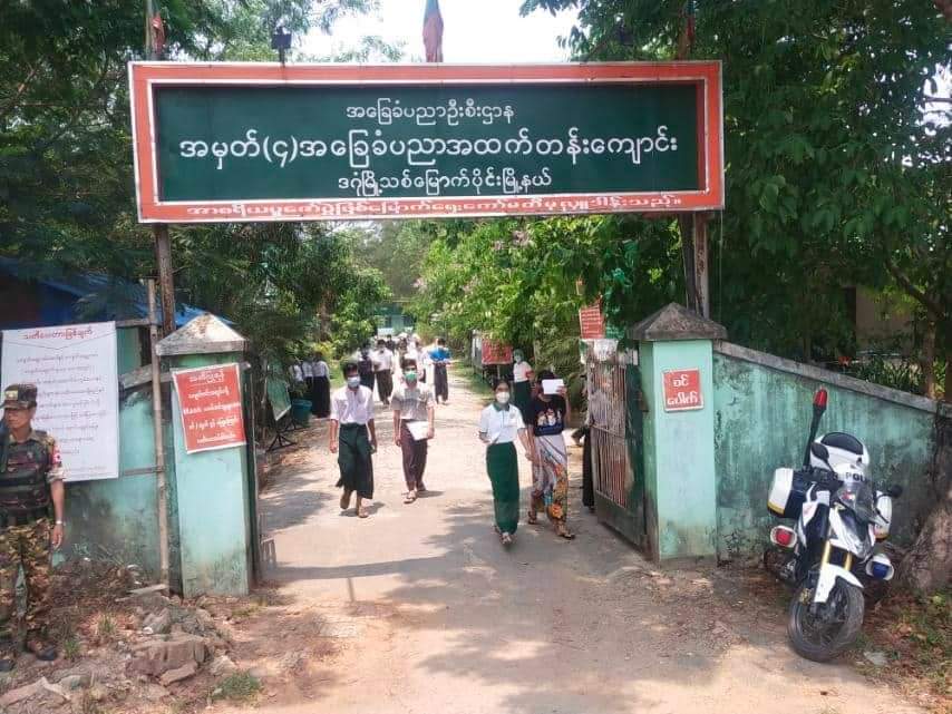ရန်ကုန်တိုင်းဒေသကြီး၊ အရှေ့ပိုင်းခရိုင်၊ ဒဂုံမြို့သစ်(မြောက်ပိုင်း)မြို့နယ်တွင် ၂၀၂၂ ခုနှစ် တက္ကသိုလ်ဝင်စာမေးပွဲကို ကျောင်းသား/ကျောင်းသူများမှ ယနေ့ နံနက် (၉) နာရီအချိန်က စတင်၍ နေ့လည်၁၂ နာရီထိ သမိုင်းဘာသာရပ်ကို ဖြေဆို လျက်ရှိကြောင်း သိရသည်။
