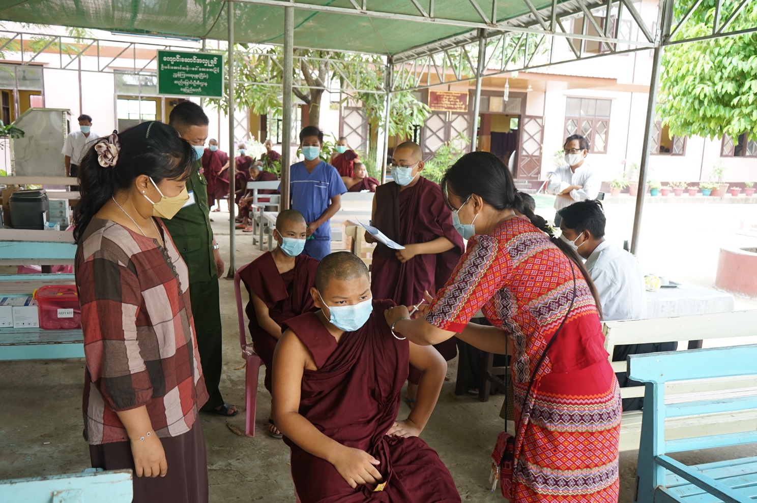 ထိုသို့ဆောင်ရွက်ရာတွင် မြို့နယ်စီမံအုပ်ချုပ်ရေးအဖွဲ့ဥက္ကဌ ဦးရဲမြတ်သိန်း၊အဖွဲ့ဝင်(၁) ဗိုလ်မှူးပြည့်ဖြိုးမင်း၊ မြို့နယ်ပြည်သူ့ကျန်းမာရေးဦးစီးဌာနမှူး ဒေါက်တာဝါဝါညွှန့်ရွှေ တို့၏ ကြီးကြပ်မှုဖြင့် မြို့နယ်ပြည်သူ့ကျန်းမာရေးဦးစီးဌာနမှ ဝန်ထမ်းများက ကျောင်းတိုက် အတွင်းရှိ အသက် ၁၅ နှစ်မှ ၁၈ နှစ်ကြား သံဃာတော်(၄၂)ပါးအား ကိုဗစ်-၁၉ ရောဂါ ကာကွယ်ဆေး(Sinovac) ထိုးနှံပေးခဲ့သည်။