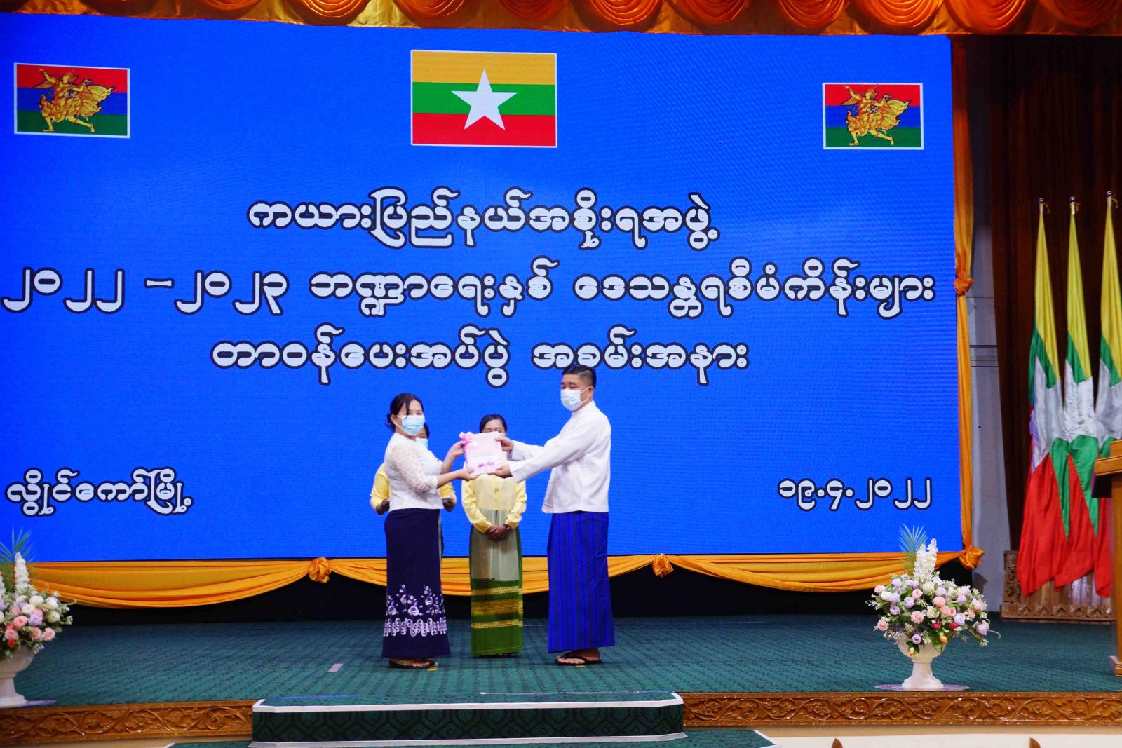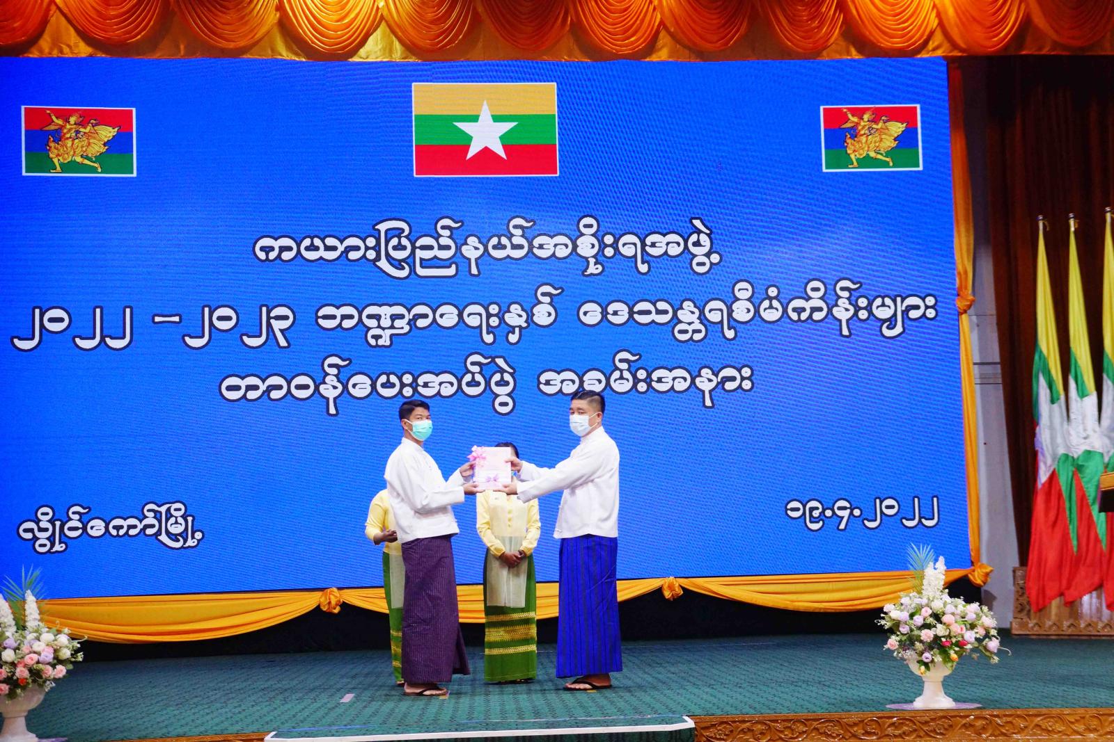 ကယားပြည်နယ် အစိုးရအဖွဲ့၏ ၂၀၂၂-၂၀၂၃ ဘဏ္ဍာရေးနှစ် ဒေသန္တရစီမံကိန်းများ တာဝန်ပေးအပ်ပွဲကို ယနေ့နံနက် ၉ နာရီအချိန်က လွိုင်ကော်မြို့ ပြည်နယ်ခန်းမ၌ ကျင်းပပြုလုပ်ခဲ့သည်။