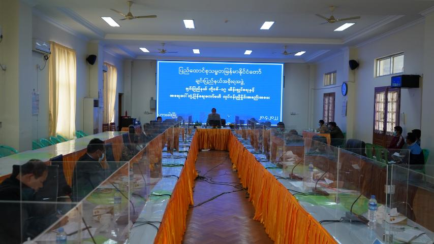 ယင်းနောက် ပြည်နယ်ပြည်သူ့ကျန်းမာရေးနှင့် ကုသရေးဦးစီးဌာနမှူး ဒေါက်တာ အောင်မြင့်ဦးက ကိုဗစ်-၁၉ ရောဂါ ကာကွယ်ထိန်းချုပ်ရေးလုပ်ငန်းများ ဆောင်ရွက်မှု၊ မြို့နယ်အလိုက် အသက် ၁၈ နှစ်နှင့် အထက် ကိုဗစ်-၁၉ ရောဂါ ကာကွယ်ဆေး ထိုးနှံပြီးစီးမှုအခြေအနေ၊ ကိုဗစ်−၁၉ ရောဂါကာကွယ်ဆေး ရရှိ ၊ သုံးစွဲ ၊ လက်ကျန်စာရင်းနှင့် ထောက်ပံ့ရန်လိုအပ်သည့် ကိုဗစ်−၁၉ ရောဂါ ကာကွယ်ဆေးနှင့် ဆေးပစ္စည်း အခြေအနေများကို Power Point ဖြင့် ရှင်းလင်းတင်ပြပြီး တက်ရောက်လာကြသည့် ဌာနဆိုင်ရာတာဝန်ရှိသူများက ကိုဗစ်-၁၉ ရောဂါ ကာကွယ်ဆေး ထိုးနှံ ပေးနေမှု၊ Booster Dose ထိုးနှံပေးနေမှုနှင့် ဆက်လက်ဆောင်ရွက်မည့် အစီအမံများ၊ ကိုဗစ်−၁၉ ရောဂါကာကွယ်ဆေးထိုးနှံပြီးသူများ စာရင်းဇယားရေးသွင်းပြီးစီးမှု အခြေအနေနှင့် RDT Test Kit ဖြင့် စမ်းသပ်စစ်ဆေးသည့်လုပ်ငန်းကို စဉ်ဆက်မပြတ် ဆောင်ရွက်မှု အခြေအနေများကို ရှင်းလင်းတင်ပြကြသည်။