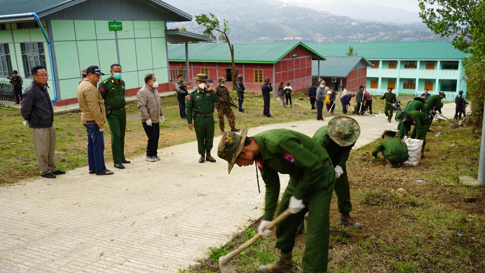 ထိုသို့ ပြည်သူ့အကျိုးပြုစုပေါင်းသန့်ရှင်းရေး ဆေင်ရွက်ရာတွင် နယ်မြေခံတပ်ရင်းတပ်ဖွဲ့များမှ တပ်မတော်သားများ၊ အထွေထွေအုပ်ချုပ်ရေးဦးစီးဌာန၊ မြန်မာနိုင်ငံရဲတပ်ဖွဲ့၊ မီးသတ်တပ်ဖွဲ့၊ စည်ပင်သာယာရေးအဖွဲ့ ဝန်ထမ်းများ စုစုပေါင်း အင်အား ၁၅၀ ဦးခန့်ဖြင့် အမှတ် (၂) အခြေခံပညာ အထက်တန်းကျောင်းဝင်းအတွင်း ချုံနွယ်ပေါင်းမြက်များ ခုတ်ထွင်ရှင်းလင်းခြင်း၊ ပေါင်းမြက်များနှင့် အမှိုက်များ ရှင်းလင်းခြင်းတို့ကို စုပေါင်းဆောင်ရွက်ခဲ့ကြသည်။