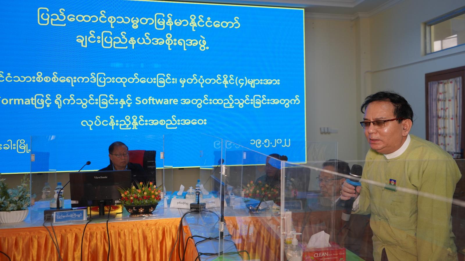 ဆက်လက်၍ ပြည်နယ်လူမှုရေးရာဝန်ကြီး ဦးသန့်ဇင်က ပြည်နယ်အတွင်းရှိ မြို့နယ်အလိုက် နိုင်(၄) မှတ်တမ်းပါ နိုင်ငံသားအမှတ်နှင့် အချက်အလက်များအား Excel Format အတွင်း ရိုက်သွင်းခြင်း နှင့် Software အတွင်း ထည့်သွင်းခြင်းလုပ်ငန်းများနှင့် ပတ်သက်၍ ၁၈-၅-၂၀၂၂ ရက်နေ့အထိ လုပ်ငန်းဆောင်ရွက်ပြီးစီးမှုနှင့် ဆောင်ရွက်ရန်ကျန် အခြေအနေနှင့် ဇွန်လ(၃၀) ရက်နေ့တွင် ပြီးစီး နိုင်ရေးအတွက် ဆက်လက်ဆောင်ရွက်မည့် အစီအမံများကို Power Point ဖြင့် ရှင်းလင်းတင်ပြပြီး တက်ရောက်လာကြသည့် ဌာနဆိုင်ရာတာဝန်ရှိသူများက ကွန်ပျူတာကျွမ်းကျင်သည့် ဝန်ထမ်းများ နှင့် အကူဝန်ထမ်းများဖြင့် နိုင်(၄)မှတ်တမ်းများအား စာရင်းရေးသွင်းဆောင်ရွက်ရာတွင် တွေ့ကြုံရ သည့် အခက်အခဲများနှင့် လိုအပ်ချက်များကို ဆွေးနွေးတင်ပြကြသည်။