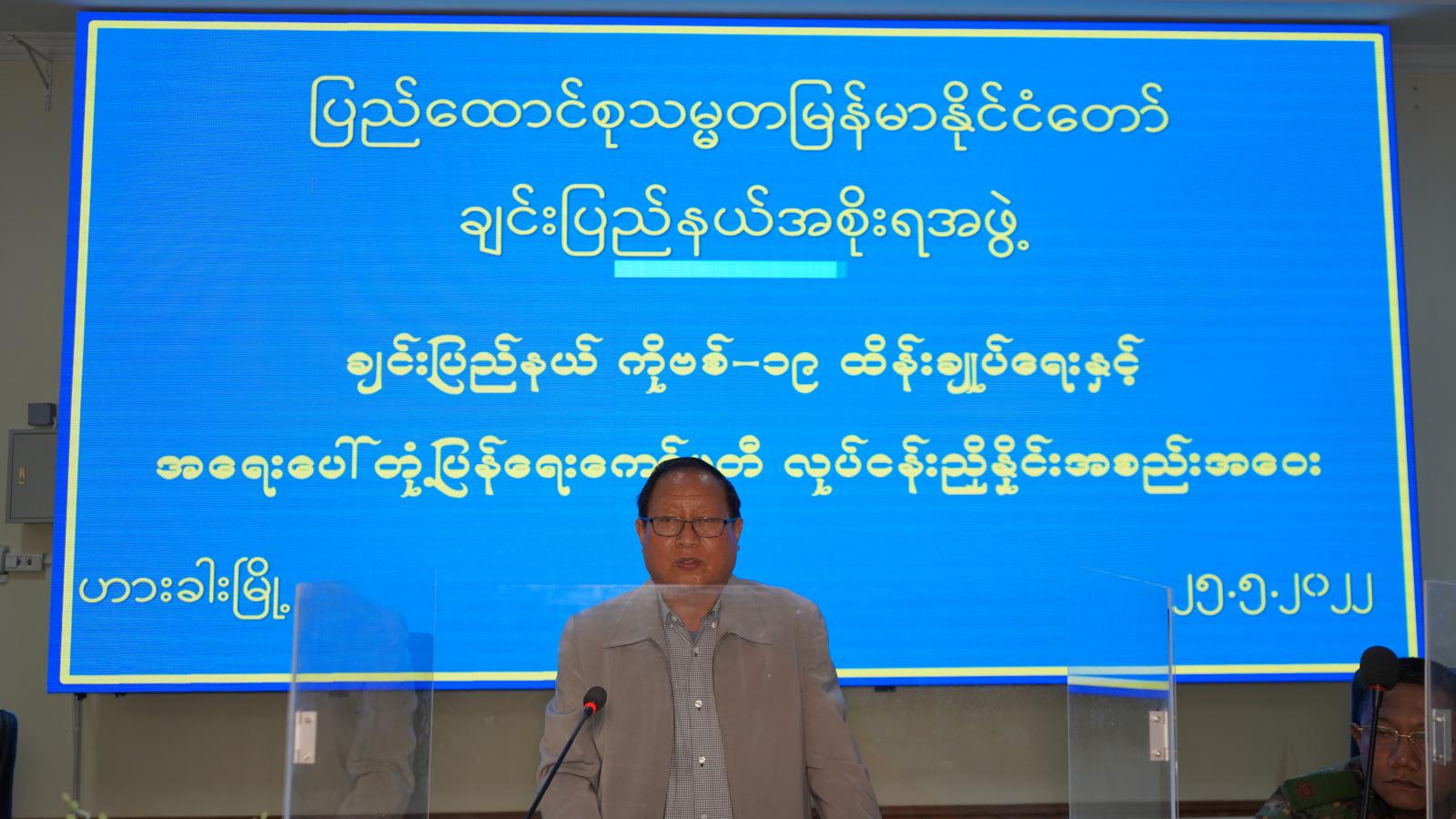 ချင်းပြည်နယ် ကိုဗစ်-၁၉ ထိန်းချုပ်ရေးနှင့် အရေးပေါ်တုံ့ပြန်ရေးကော်မတီ လုပ်ငန်းညှိနှိုင်း အစည်းအဝေးကို ယမန်နေ့ နံနက် ၁၀ နာရီက ဟားခါးမြို့ ပြည်နယ်အစိုးရအဖွဲ့ရုံး အစည်းအဝေး ခန်းမ၌ ကျင်းပရာ ပြည်နယ်ဝန်ကြီးချုပ် ဦးငွန်ဆန်းအောင် တက်ရောက်အမှာစကား ပြောကြားသည်။