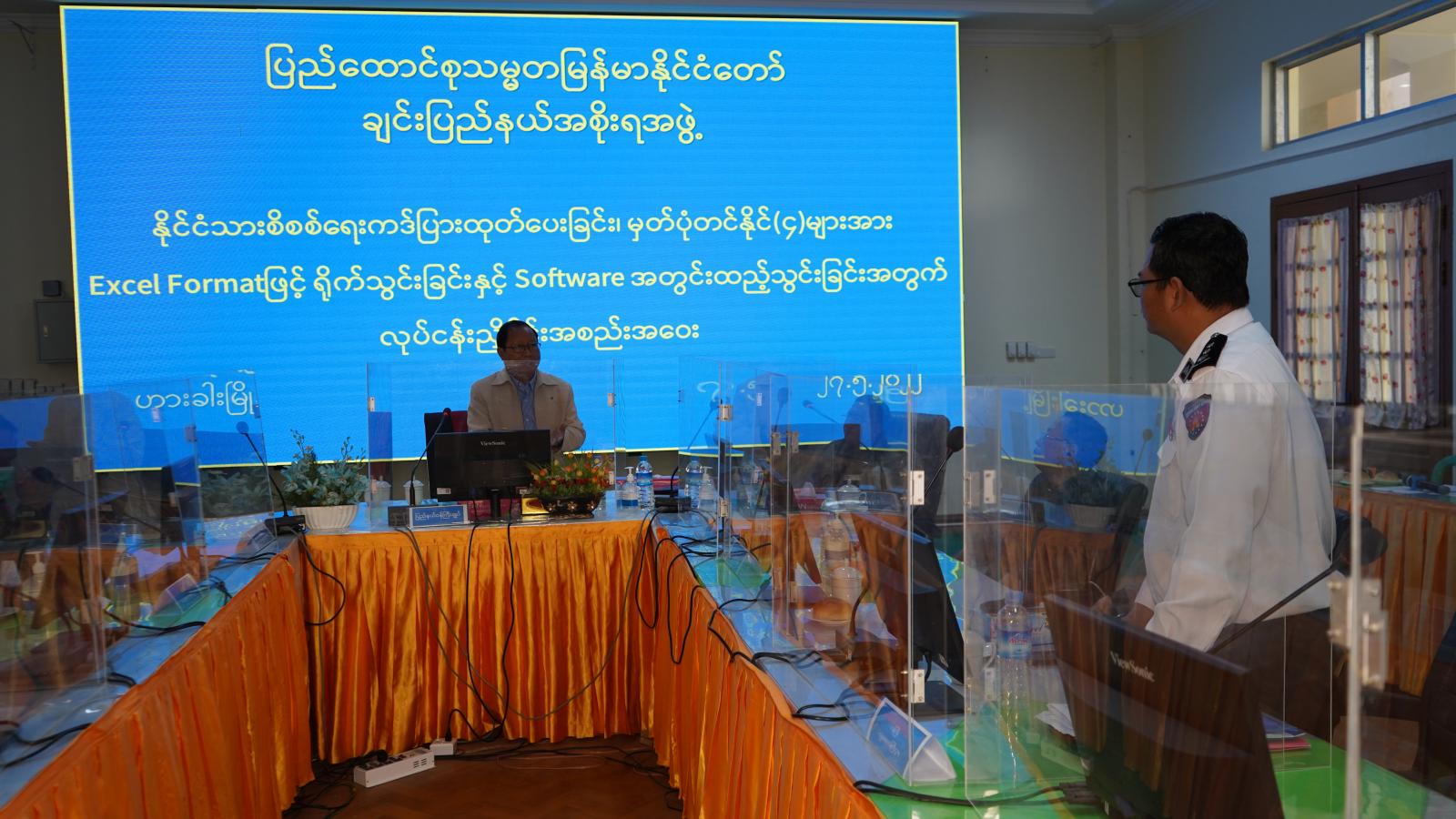 ချင်းပြည်နယ်အစိုးရအဖွဲ့ဝင်များနှင့် ပြည်နယ်အဆင့်ဌာနဆိုင်ရာတာဝန်ရှိသူများ၏ နိုင်ငံသား စိစစ်ရေး ကတ်ပြားထုတ်ပေးခြင်း ၊ မှတ်ပုံတင်နိုင် ( ၄ ) များအား Excel Format ဖြင့် ရိုက်သွင်းခြင်းနှင့် Software အတွင်း ထည့်သွင်းခြင်းဆိုင်ရာလုပ်ငန်းညှိနှိုင်းအစည်းအဝေးကို မေလ ၂၇ ရက် မွန်းလွဲပိုင်းက ဟားခါးမြို့ ၊ ပြည်နယ်အစိုးရအဖွဲ့ ရုံး အစည်းအဝေးခန်းမ၌ ကျင်းပသည်။