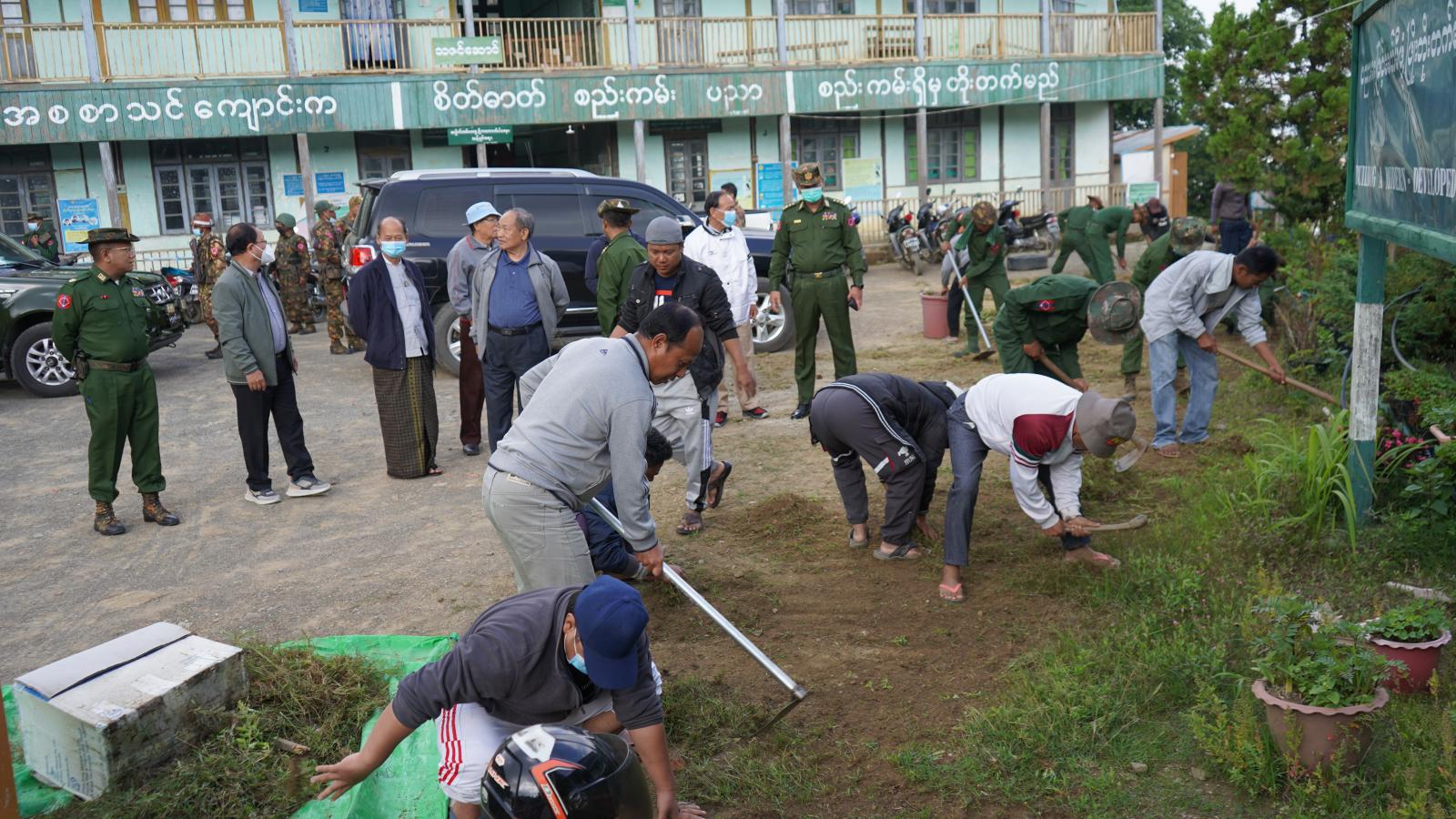 ထိုသို့ ပြည်သူ့အကျိုးပြု စုပေါင်းသန့်ရှင်းရေး ဆောင်ရွက်ရာတွင် နယ်မြေခံတပ်ရင်း တပ်ဖွဲ့များမှ တပ်မတော်သားများ၊ အထွေထွေအုပ်ချုပ်ရေးဦးစီးဌာန၊ မြန်မာနိုင်ငံရဲတပ်ဖွဲ့၊ ပညာရေး၊ စည်ပင်သာယာရေးအဖွဲ့ ဝန်ထမ်းများက ကျောင်းဝန်းအတွင်းရှိ ချုံနွယ်၊ ပေါင်းမြက်များ ခုတ်ထွင်ရှင်းလင်းခြင်းနှင့် အမှိုက်များ ရှင်းလင်းခြင်းနှင့် ဗိုလ်ချုပ်လမ်းမကြီးရှိ နွယ်ဆွရေမြောင်းအတွင်းရှိ အမှိုက်များ ရှင်းလင်းခြင်းတို့ကို စုပေါင်းဆောင်ရွက်ခဲ့ကြသည်။
