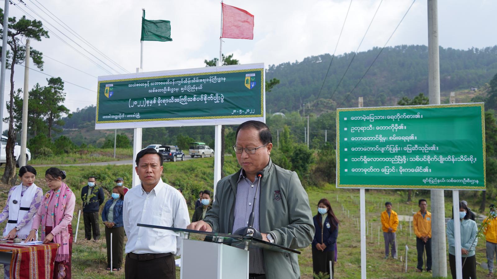 ထို့နောက် ချင်းပြည်နယ်အစိုးရအဖွဲ့၏လမ်းညွှန်မှုဖြင့် ပြည်နယ်သစ်တောဦးစီးဌာနမှ သဘာဝ ပတ်ဝန်းကျင် စိမ်းလန်းစိုပြေရေးလူထုလှုပ်ရှားမှုအဖြစ် ၂၀၂၂ မိုးရာသီအကြို သစ်ပင်စိုက်ပျိုးပွဲ အခမ်းအနားကို ယမန်နေ့နံနက်ပိုင်းတွင် ဟားခါးတက္ကသိုလ်ဝင်းအတွင်း ကျင်းပရာ ပြည်နယ်ဝန်ကြီးချုပ် ဦးငွန်ဆန်းအောင်က သဘာဝပတ်ဝန်းကျင် စိမ်းလန်းစိုပြေလာစေရန်၊ ရာသီဥတုမျှတ ကောင်းမွန်လာစေရန်၊ သဘာဝဘေးအန္တရာယ်များဖြစ်သည့် ရေကြီးခြင်း၊ မြေပြိုခြင်း၊ လေထုညစ်ညမ်းခြင်း စသည်များကို ကာကွယ်နိုင်စေရန်နှင့် သစ်တောသစ်ပင်များကို ပိုမိုတန်ဖိုးထား ချစ်ခင်မြတ်နိုးလာစေရန်တို့အတွက် ရည်ရွယ်ပြီး ယခုလို မိုးရာသီအကြို သစ်ပင်စိုက်ပျိုးပွဲတော် ကျင်းပရခြင်းဖြစ်ကြောင်း၊ “ရှင်အောင်စိုက်ပျိုး၊ ကြီးအောင်ပြုစု၊ မြဲအောင်ထိန်းသိမ်း”ဆိုသည့်အတိုင်း သစ်တော၊ သစ်ပင်များ ထာဝစဉ်ရှင်သန် တည်မြဲစေရန်နှင့် သစ်တော၊ သစ်ပင်များ၏ အကျိုးကျေးဇူးကို သားစဉ်မြေးဆက် ခံစားစေရန်အတွက် အမျိုးသားတာဝန် တစ်ရပ်အနေဖြင့် ပြည်သူတစ်ရပ်လုံးက ပူးပေါင်းပါဝင်စိုက်ပျိုးပြုစုထိန်းသိမ်းကြရန် တိုက်တွန်းကြောင်းဖြင့် အမှာစကား ပြောကြားသည်။