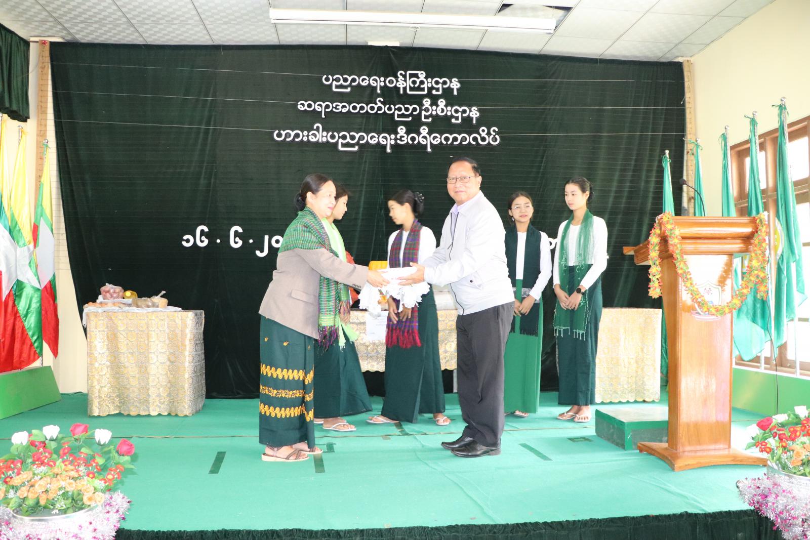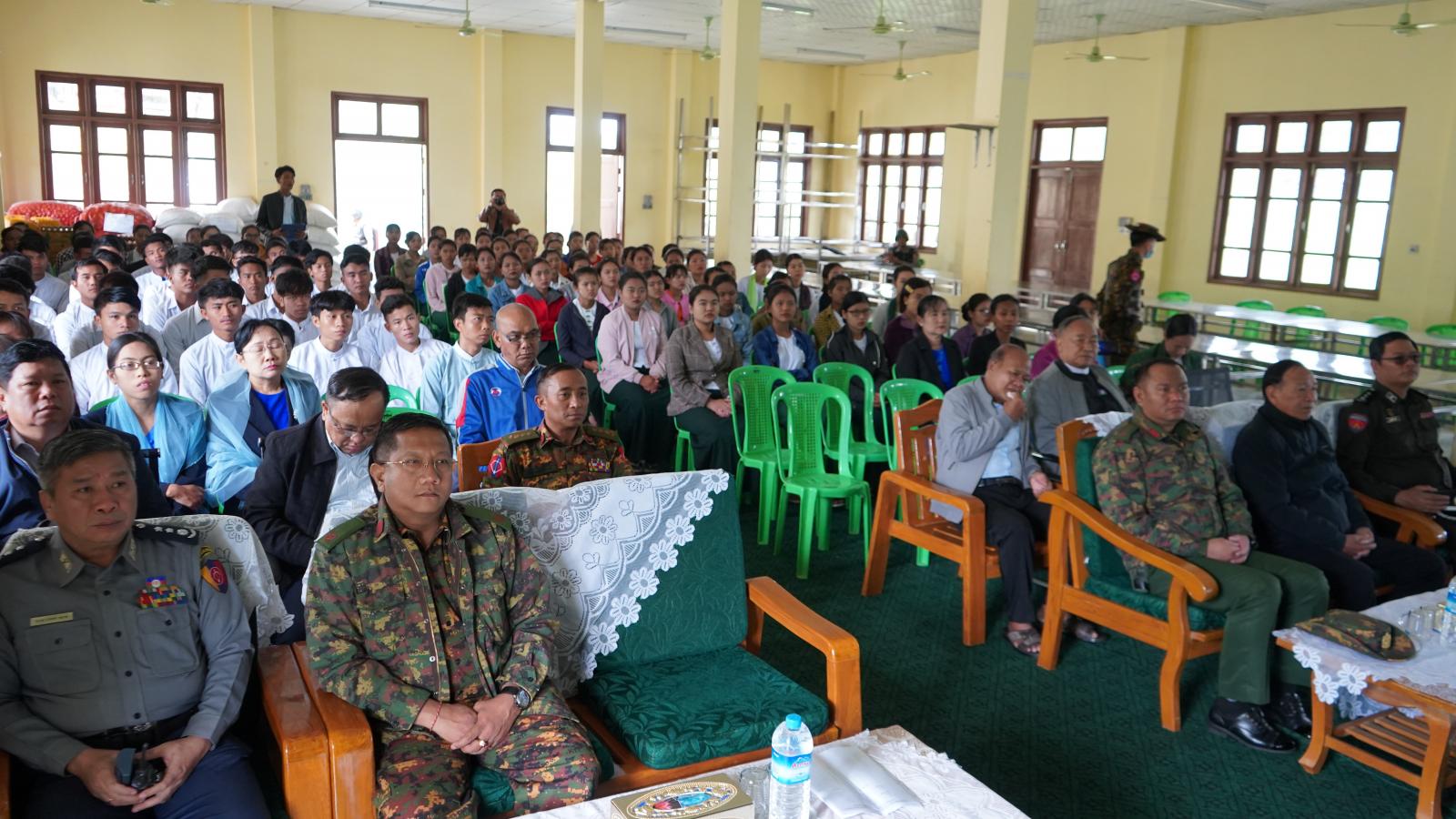 ထို့နောက် ပြည်နယ်ဝန်ကြီးချုပ်က ကျောင်းအုပ်ကြီး၊ နည်းပြများနှင့် သင်တန်းသား၊ သင်တန်းသူ များအား ရင်းရင်းနှီးနှီး နှုတ်ဆက် အားပေးစကားပြောကြားပြီး ပြည်နယ်ဝန်ကြီးချုပ်၊ ပြည်နယ်အစိုးရအဖွဲ့ဝင် ဝန်ကြီးများ၊ ပြည်နယ်ဥပဒေချုပ် ဦးဆွန်းဒုတ်ကျင့်၊ အနောက်မြောက်တိုင်းစစ် ဌာနချုပ် ဒုတိယတိုင်းမှူး၊ ဟားခါးတပ်နယ် (အခြေချ) စစ်ဗျူဟာမှူး ဗိုလ်မှူးကြီး စောထွန်းနှင့် ဟားခါးခရိုင် စီမံအုပ်ချုပ်ရေးအဖွဲ့ဥက္ကဋ္ဌ ဦးကျော်စိုးလွင်တို့က ထောက်ပံ့ငွေများ ပေးအပ်ကြသည်။