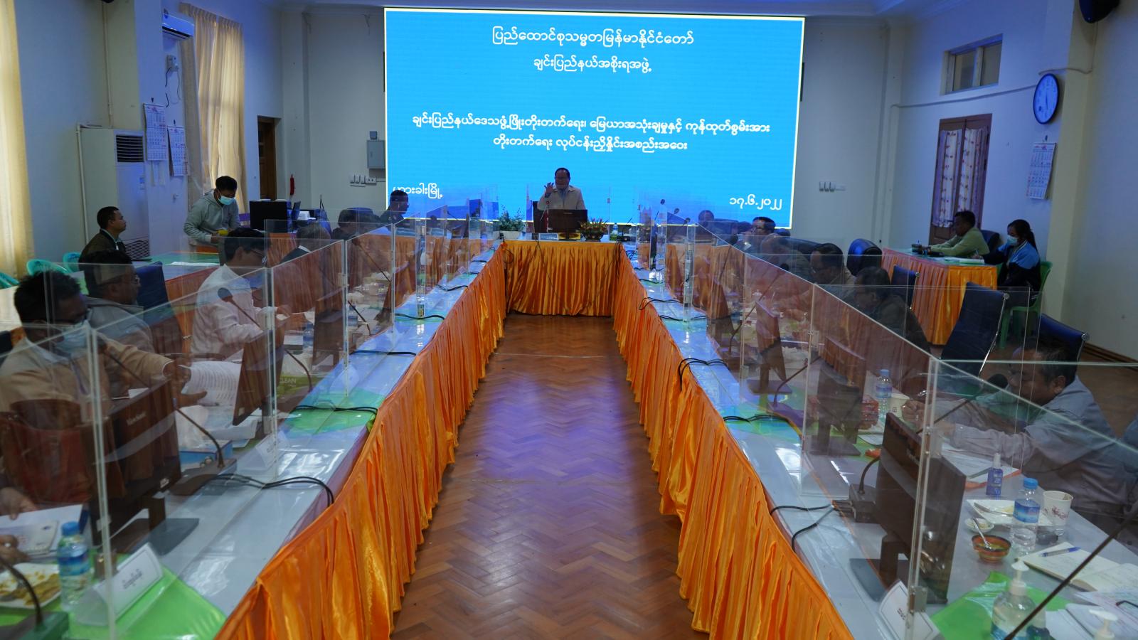 ယင်းနောက် ပြည်နယ်စိုက်ပျိုးရေးဦးစီးဌာန၊ ပြည်နယ်ဦးစီးမှူး ဦးအောင်မျိုးဦး၊ ပြည်နယ်မွေးမြူရေး နှင့်ကုသရေးဦးစီးဌာနမှ ဒေါက်တာကျော်လွင်၊ ပြည်နယ်ဆည်မြောင်းနှင့်ရေအသုံးချမှုစီမံခန့်ခွဲရေးဦးစီး ဌာနမှ ဦးစီးအရာရှိ ဦးသန်းနိုင်၊ ပြည်နယ်ငါးလုပ်ငန်းဦးစီးဌာနမှ ဦးစီးအရာရှိ ဒေါ်ရှန်းနှဲမ်ရင်၊ အမှတ် (၃) ကုန်းမြင့်ဒေသလယ်ယာမြေဖော်ထုတ်ရေးစီမံကိန်းရုံးမှ ပြည်နယ်ဦးစီးမှူး ဦးကျော်ဇောလှ၊ ပြည်နယ် လယ်ယာမြေစီမံခန့်ခွဲရေးနှင့်စာရင်းအင်းဦးစီးဌာနမှ ပြည်နယ်ဦးစီးမှူး ဦးမြင့်ကြိုင်၊ ပြည်နယ်ကျေးလက် ဒေသဖွံ့ဖြိုးတိုးတက်ရေးဦးစီးဌာနမှ ပြည်နယ်ဦးစီးမှူး ဦးတမ်အောင်၊ ပြည်နယ်သမဝါယမဦးစီးဌာနမှ၊ ပြည်နယ်ဦးစီးမှူး ဦးမင်းဇော်ထွန်း၊ ပြည်နယ်အသေးစားစက်မှုလက်မှုလုပ်ငန်းဦးစီးဌာနမှ ပြည်နယ်ဦးစီးမှူး ဦးဝင်းနိုင်နှင့် ပြည်နယ်လျှပ်စစ်အင်ဂျင်နီယာမှူးရုံးမှ ပြည်နယ်အင်ဂျင်နီယာ ဦးမျိုးဝင်းတို့က မိမိတို့ကဏ္ဍအလိုက် လုပ်ငန်းဆောင်ရွက်ပြီး၊ ဆောင်ရွက်ဆဲ၊ ဆောင်ရွက်ရန်ကျန်နှင့် ဆက်လက်ဆောင်ရွက်မည့်အစီအမံများကို Power Point ဖြင့် တစ်ဦးချင်း ရှင်းလင်းတင်ပြကြပြီး တင်ပြချက်များအပေါ် ပြည်နယ်စီမံကိန်း ဦးစီးဌာန၊ ပြည်နယ်ဦးစီးမှူး ဦးဝင်းမြင့်က အကြံပြု ဖြည့်စွက်ဆွေးနွေးသည်။
