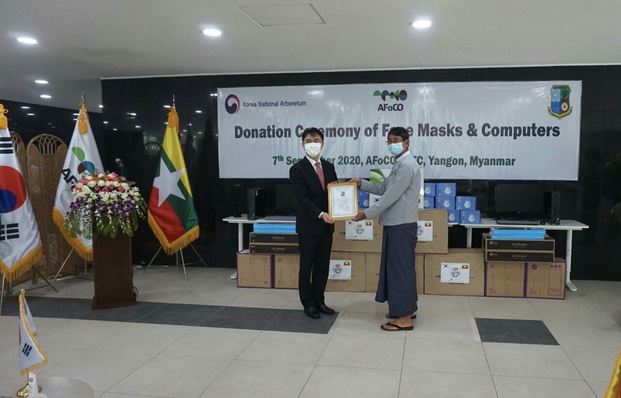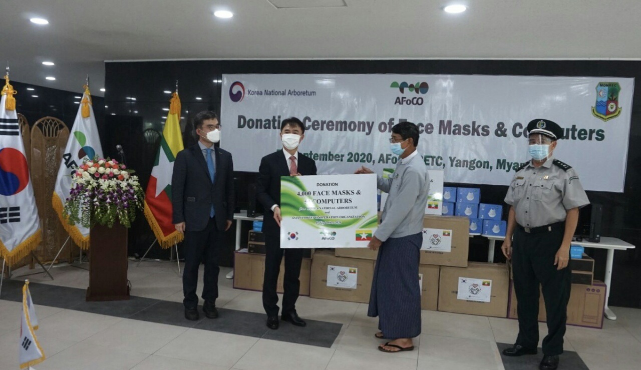 ထို့နောက်မြန်မာနိုင်ငံဆိုင်ရာ ကိုရီးယားသံအမတ်ကြီးက ပါးစပ်နှင့် နှာခေါင်းစည်း (KF -80 Masks)(၄၀၀၀)ခုနှင့် ကွန်ပျူတာအလုံး(၅၀)တို့ကို သယံဇာတနှင့်သဘာဝ ပတ်ဝန်းကျင် ထိန်းသိမ်းရေးဝန်ကြီးဌာနသို့ ပေးအပ်လှူဒါန်းရာ မြန်မာ့သစ်တောလုပ်ငန်း ဦးဆောင်ညွှန်ကြား ရေးမှူး ဦးစောဂျွန်ရွှေဘကလက်ခံရယူခဲ့ပြီး အလှူရှင်များ ဖြစ်သည့် ကိုရီးယားအမျိုးသား သစ်တော ဥယျာဉ် (Korea National Arboretum)နှင့် အာရှဒေသ သစ်တော ကဏ္ဏ ပူးပေါင်း ဆောင်ရွက်မှုအဖွဲ့အစည်း အထွေထွေ အတွင်းရေးမှူးရုံး AFoCo Secretariat တို့အား ဂုဏ်ပြု မှတ်တမ်းလွှာများ ပြန်လည်ပေးအပ်ခဲ့ကြောင်း သိရသည်။