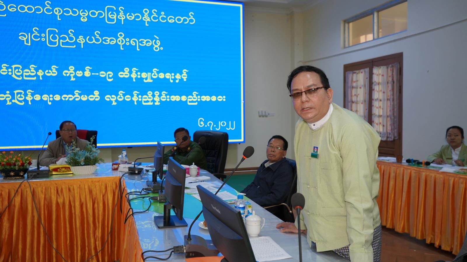 ထို့နောက် စစ်ဗျူဟာအဖွဲ့အခြေချ (ဟားခါး) စစ်ဗျူဟာမှူး ဗိုလ်မှူးကြီး စောထွန်းမှ ဆွေးနွေးတင်ပြရာတွင် မြို့နယ်များအလိုက် ကိုဗစ်−၁၉ ကာကွယ်ဆေး ထိုးနှံရေးလုပ်ငန်းများ ဆောင်ရွက်နေမှုများအပေါ် တပ်မတော် နှင့် မြန်မာနိုင်ငံရဲတပ်ဖွဲ့တို့မှ လိုအပ်သည့် လုံခြုံရေးကိစ္စရပ်များ ညှိနှိုင်း ပေါင်းစပ်ဆောင်ရွက်ပေး လျက်ရှိပါ ကြောင်းနှင့် ပြည်နယ်အစိုးရအဖွဲ့အတွင်းရေးမှူး ဦးမောင်မောင်ဆန်းတို့က အသက် (၅) နှစ်မှ (၁၂)နှစ် အတွင်းရှိ ကျောင်းသား၊ ကျောင်းသူများ ကိုဗစ်−၁၉ ရောဂါ ကာကွယ်ဆေးထိုးနှံပြီးစီးမှုကို VMIS စနစ်တွင် စာရင်းရေး သွင်းရာတွင် ကျောင်းပြင်ပကလေးသူငယ်များ ကာကွယ်ဆေးထိုးနှံမှုကိုပါ စာရင်း ထည့်သွင်းရေးနှင့် စာရင်း ရေးသွင်းရာတွင် အားနည်းချက်များ ပြုပြင်၍ မှန်ကန်စွာ ရေးသွင်းရန်လိုအပ်မှု၊ မြို့နယ်အလိုက် ကိုဗစ်-၁၉ ကာကွယ်ဆေးလက်ကျန်များ အချိန်မီ ထိုးနှံပြီးစီးရေးအတွက် ကြပ်မတ်ပေးနေမှုနှင့် လုံခြုံရေး ဆိုင်ရာများကို ဆွေးနွေးတင်ပြကြသည်။