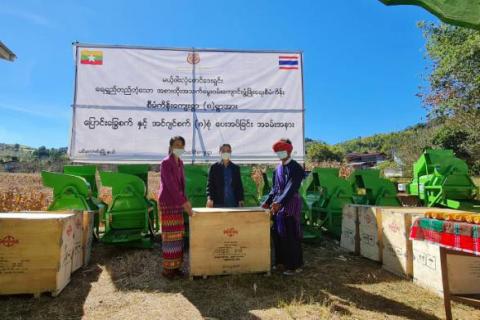 ရှမ်းပြည်နယ်တောင်ပိုင်း၊ ပအိုဝ်းကိုယ်ပိုင်အုပ်ချုပ်ခွင့်ရဒေသ၊ ပင်လောင်းမြို့နယ်၌ ရေရှည်တည်တံ့သော အစားထိုးအသက်မွေးဝမ်းကျောင်းဖွံ့ဖြိုးရေးစီမံကိန်းဆောင်ရွက်နေသည့် ပေါ့အင်ကျေးရွာအုပ်စုနှင့် လွယ်မောကျေးရွာအုပ်စု အတွင်းရှိ ကျေးရွာ ရှစ်ရွာ အတွက် ပြောင်းခြွေစက် ရှစ်လုံးနှင့် အင်ဂျင်စက် ရှစ်လုံးကို ယနေ့နံနက်ပိုင်းတွင် ပေါ့အင်ကျေးရွာအုပ်စု၊ ဆောင်းပေါင်ကျေးရွာတွင် ထောက်ပံ့ပေးအပ်ခဲ့သည်။