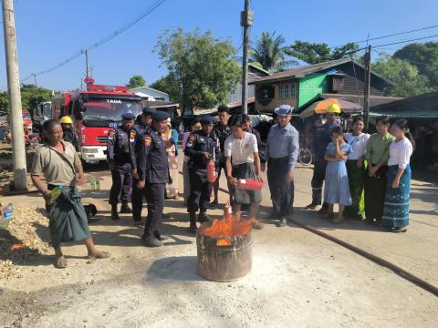 တံတားမြို့၌ မီးဘေးကြိုတင်ကာကွယ်ရေးအတွက် အောင်သီရိဈေးအတွင်း မီးသတ်ဆေးဗူးများ စစ်ဆေးခြင်းနှင့် မီးငြှိမ်းသတ်ရေး လက်တွေ့သရုပ်ပြဆောင်ရွက်