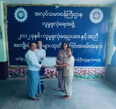 ရန်ကုန်တိုင်းဒေသကြီး မင်္ဂလာဒုံမြို့နယ် လူမှုဖူလုံရေးရုံးတွင် အကျုံးဝင်မှတ်ပုံတင်ထားသည့် Mother Industry Co.,Ltd မှ အာမခံအလုပ်သမား ဦးထွန်းသိန်းစိုး၏ လုပ်ငန်းခွင်ထိခိုက် သေဆုံးခြင်းအတွက် ကျန်ရစ်သူအကျိုးခံစားခွင့် (ငွေလုံးငွေရင်း)ထုတ်ပေးခြင်း အခမ်းအနားကို ယမန်နေ့မွန်းလွဲ ၂ နာရီက ရန်ကုန်တိုင်းဒေသကြီး လူမှုဖူလုံရေးရုံး၊ အစည်းအဝေးခန်းမ၌ ကျင်းပသည်။