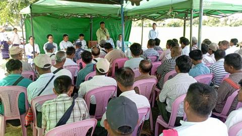 မန္တလေးတိုင်းဒေသကြီး ကျောက်ဆည်ခရိုင် မြစ်သားမြို့နယ် သီလင်ကျေးရွာအုပ်စု၊ ခန္တီးလေး ကျေးရွာနေ တောင်သူ ဦးအောင်ကျော်စိုးစံ၏ (၅)ဧကစိုက် မိုးစပါးပန်းတိုင်အထွက်နှုန်းရရှိရေး အောင်နိုင်တိုးစပါးစိုက်ခင်းတွင် မြေသြဇာ ( ၃ : ၁ ) ရောစပ် ကြဲပက်ခြင်းကွင်းသရုပ်ပြပွဲကို ယနေ့နံနက် ၁၀နာရီက ပြုလုပ်သည်။