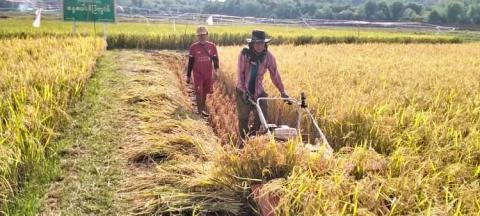 တာလေမြို့၌ ဘောင်စနစ်အသုံးပြု၍ ဇကာပိုက်ဖြင့်ပျိုးထောင်စိုက်ပျိုးသည့် (ဘာစမတီ) မျိုးစပါး စမ်းသပ်စိုက်ပျိုးကွက် (၅)ဧက စတင်ရိတ်သိမ်း