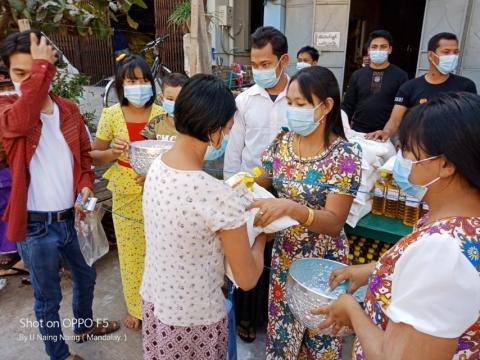 ကိုဗစ်-၁၉ကာလအတွင်း ပုံမှန်ဝင်ငွေမရှိကြသည့် အခြေခံလူတန်းစား အိမ်ထောင်စုများအားဒုတိယ အကြိမ်မြောက် စားသောက်ကုန်ပစ္စည်းများ ထောက်ပံ့လှူဒါန်းခြင်းကို ယမန်နေ့ ညနေ၄ နာရီက မန္တလေးမြို့၊ အောင်မြေသာစံမြို့နယ်၊ ပြည်လုံးချမ်း သာရပ်ကွက်၊ အကွက်(၅၅)၊ ၈၁လမ်း၊၁၃လမ်းနှင့် ၁၄လမ်းကြားရှိ အလှူရှင်မိသားစု၏ နေအိမ်ရှေ့၌ ပြုလုပ်သည်။