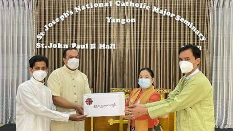 ရန်ကုန်တိုင်းဒေသကြီး၊ ရန်ကုန်အနောက်ပိုင်းခရိုင်၊ မရမ်းကုန်းမြို့နယ်အမှတ်(၇)ရပ်ကွက်ရှိ ခရစ်ယာန် ရဟန်းဖြစ်တက္ကသိုလ်၌ ယမန်နေ့နံနက်ပိုင်းက ရန်ကုန်တိုင်းဒေသကြီးကိုဗစ် -၁၉ ရောဂါ ကာကွယ်၊ ထိန်းချုပ် ကုသရေးလုပ်ငန်းများတွင်အသုံးပြုရန် MISEREOR ၏ပံ့ပိုးမှု့ဖြင့် ဂရုဏာ လူမှုစည်းလုံးညီညွတ်ရေးအသင်း (KMSS)က အလှူငွေ(၉၉၈၂၅၀၀၀)ကျပ် ပေးအပ် လှူဒါန်းခြင်းဆောင်ရွက်ခဲ့သည်။