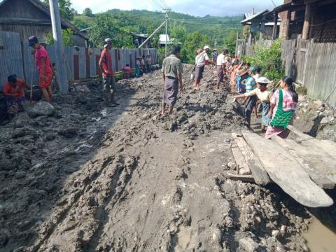 ဂန့်ဂေါခရိုင် ဆောမြို့နယ် ကျောက်ထုမြို့ဒေသ တောခလွန်ကျေးရွာတွင် ကိုယ့်အားကိုယ်ကိုး လူထုစုပေါင်းလျက် ရေထုတ်မြောင်းလမ်းများ လုပ်ငန်းဆောင်ရွက်ကြရာ