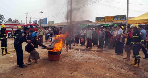ကွန်ဟိန်းမြို့၊ မြို့မစျေးရှေ့တွင် မီးဘေးကြိုတင်ကာကွယ်ရေး ဇာတ်တိုက်သရုပ်ပြခြင်း ဆောင်ရွက်