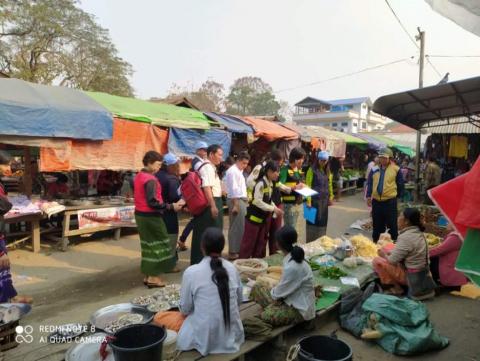 ဒီးမော့ဆို မြို့မစျေးတွင် ကိုရိုနာဗိုင်းရပ်(စ်)ရောဂါနှင့် ပတ်သက်သော အသိပညာပေး လက်ကမ်းစာစောင်များ ဖြန့်ဝေ
