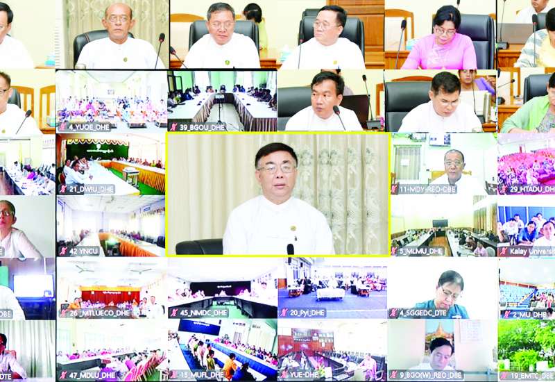 ပညာရေးဝန်ကြီးဌာနအောက်ရှိ ဦးစီးဌာနများ၊ တက္ကသိုလ်၊ ဒီဂရီကောလိပ်များ၊ ပညာရေးဒီဂရီကောလိပ်များ၊ တိုင်းဒေသကြီး၊ ပြည်နယ်ပညာရေးမှူးများနှင့် လုပ်ငန်းလမ်းညွှန် အစည်းအဝေးကို ယနေ့မွန်းလွဲပိုင်းတွင် နေပြည်တော်ပညာရေးဝန်ကြီးဌာန ရုံးအမှတ် (၁၃) ရှိ အစည်းအဝေးခန်းမ၌ Virtual စနစ်ဖြင့်ကျင်းပရာ ပညာရေးဝန်ကြီးဌာန ပြည်ထောင်စုဝန်ကြီး ဒေါက်တာညွန့်ဖေ၊ ဒုတိယဝန်ကြီးများဖြစ်ကြသော ဒေါက်တာဇော်မြင့်၊ ဒေါက်တာမိုးဇော်ထွန်း၊ ညွှန်ကြားရေးမှူးချုပ်များ၊ တက္ကသိုလ်၊ ဒီဂရီကောလိပ်များမှ ပါမောက္ခချုပ်များ၊ ကျောင်းအုပ်ကြီးများ၊ ပါမောက္ခဌာနမှူးများ၊ တိုင်းဒေသကြီး၊ ပြည်နယ်ပညာရေးမှူးများ တက်ရောက်ကြသည်။