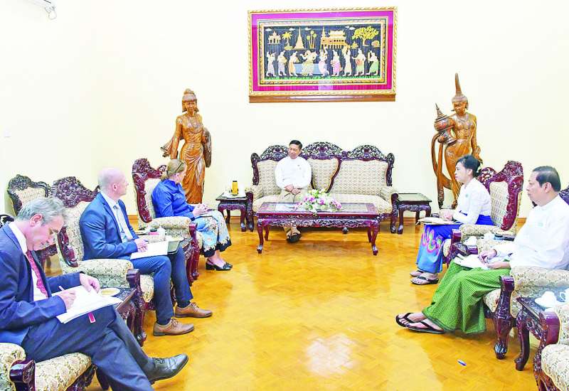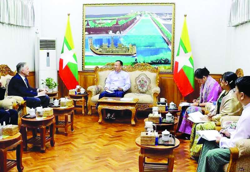 ရင်းနှီးမြှုပ်နှံမှုနှင့် နိုင်ငံခြားစီးပွားဆက်သွယ်ရေးဝန်ကြီးဌာန ပြည်ထောင်စုဝန်ကြီး ဒေါက်တာကံဇော်သည် မြန်မာနိုင်ငံမှ တာဝန်ပြီးဆုံး၍ ပြန်လည်ထွက်ခွာတော့မည့် ကမ္ဘာ့စားနပ်ရိက္ခာအစီအစဉ် (WFP) ရုံး၏ မြန်မာနိုင်ငံဆိုင်ရာ ညွှန်ကြားရေးမှူးနှင့် ကိုယ်စားလှယ် Mr. Stephen Anderson နှင့်အဖွဲ့အား ယနေ့ နံနက်ပိုင်းတွင် နေပြည်တော်ရှိ အဆိုပါဝန်ကြီးဌာန၌ လက်ခံတွေ့ဆုံသည်။