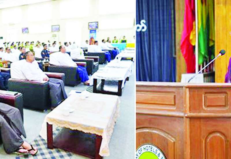 ဟိုတယ်နှင့် ခရီးသွားလာရေးဝန်ကြီးဌာနတွင် မီးဘေးလုံခြုံရေးစီမံချက် ရှင်းလင်းတင်ပြခြင်း အခမ်းအနားကို ယနေ့မွန်းလွဲပိုင်းတွင် ဝန်ကြီးဌာန ကျောက်စိမ်းခန်းမ၌ ကျင်းပရာ ပြည်ထောင်စုဝန်ကြီး ဒေါက်တာသက်သက်ခိုင်၊ ဒုတိယဝန်ကြီး ဦးဖြိုးဇော်စိုး၊ အမြဲတမ်းအတွင်းဝန်၊ ညွှန်ကြားရေးမှူးချုပ်၊ ဒုတိယအမြဲတမ်းအတွင်းဝန်နှင့် ဒုတိယညွှန်ကြားရေးမှူးချုပ်များ၊ အရာထမ်း အမှုထမ်းများ၊ မြန်မာနိုင်ငံ မီးသတ်တပ်ဖွဲ့မီးသတ်ဦးစီးဌာနမှ တာဝန်ရှိသူများ တက်ရောက်ကြသည်။