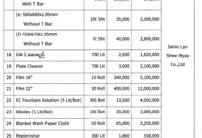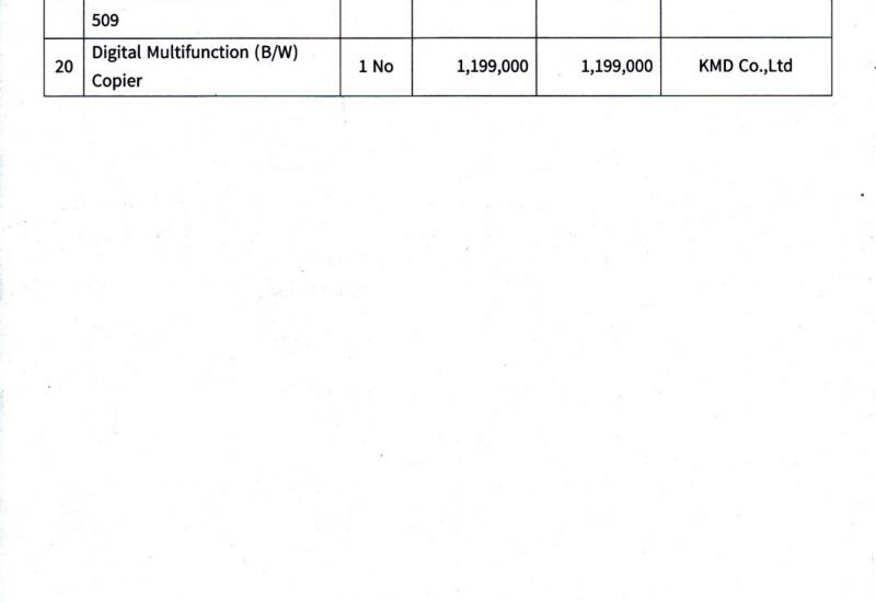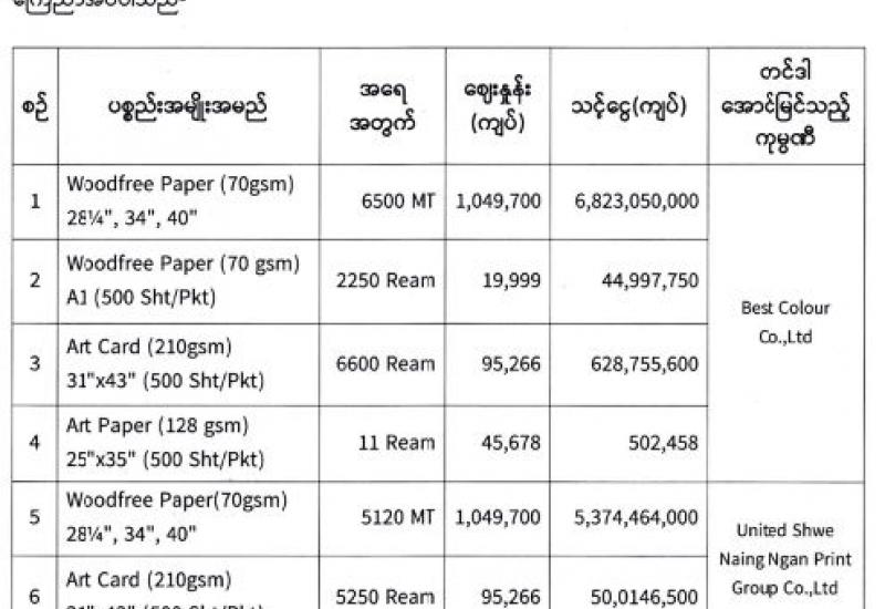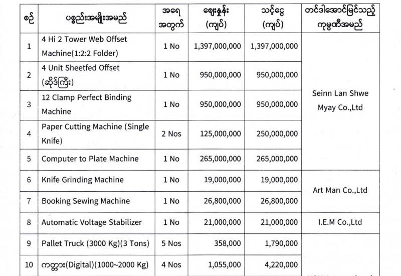 ပြန်ကြားရေးဝန်ကြီးဌာန၊ ပုံနှိပ်ရေးနှင့်ထုတ်ဝေရေးဦးစီးဌာနမှ ၂၆-၁-၂ဝ၂၁ ရက်နေ့၊ ( ၁၀ : ၀ဝ) နာရီ အချိန်တွင် ပြန်ကြားရေးဝန်ကြီးဌာန၊ ဝန်ကြီးရုံးစုဝေးခန်းမ၌ ကျင်းပပြုလုပ်သော ၂ဝ၂၀ - ၂ဝ၂၁ ဘဏ္ဍာနှစ်၊ ငွေလုံးငွေရင်းအသုံးစရိတ်ဖြင့် ဝယ်ယူမည့် လုပ်ငန်းသုံး/ရုံးသုံး စက်ကိရိယာ ပစ္စည်းများ ဝယ်ယူရန် ပြည်တွင်း/ ပြည်ပပစ္စည်းများ ဝယ်ယူရေးနှင့် ထုခွဲရောင်းချရေး ကော်မတီမှ စျေးနှုန်းစိစစ်ခဲ့ရာ တင်ဒါအောင်မြင်ခဲ့သော ကုမ္ပဏီများမှ ယှဉ်တွဲပါစျေးနှုန်းနှင့် အရေအတွက်ဖြင့် တင်ဒါအောင်မြင်ကြောင်း ကြေငြာအပ်ပါသည် -