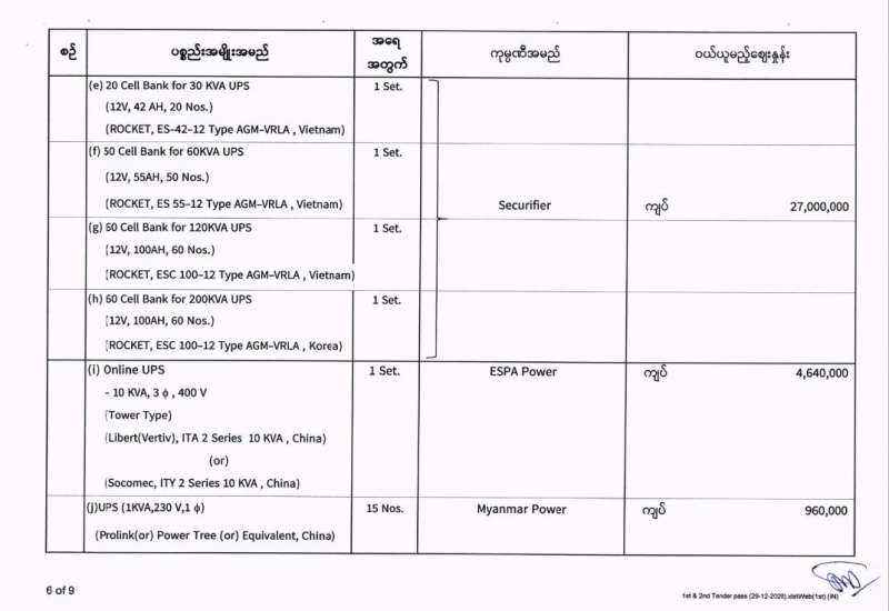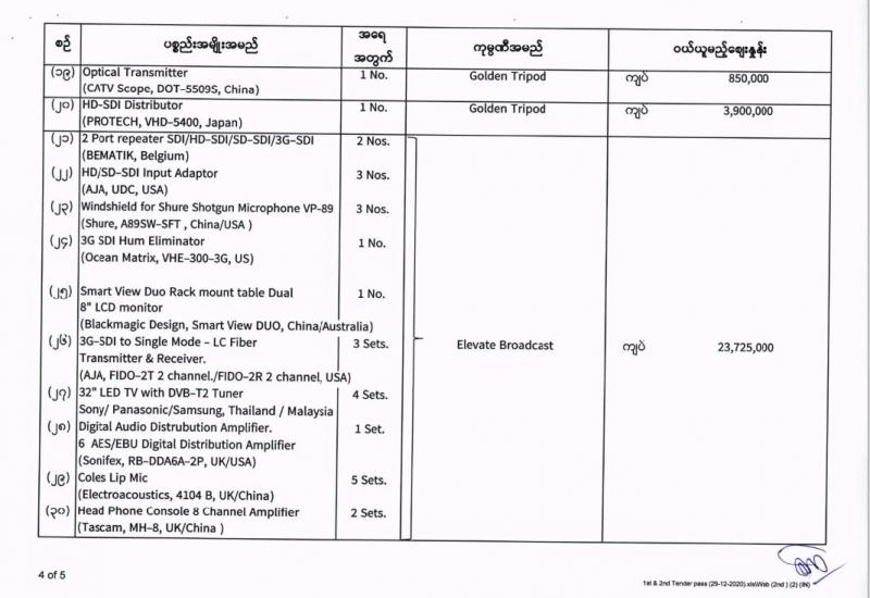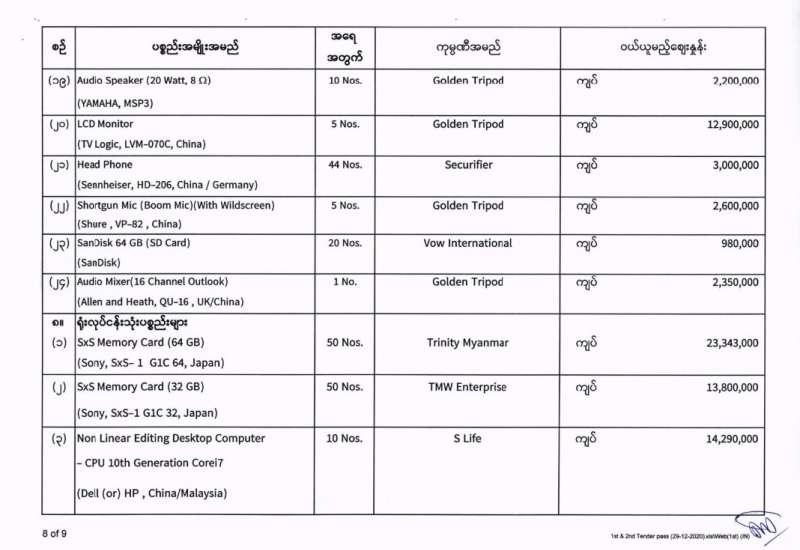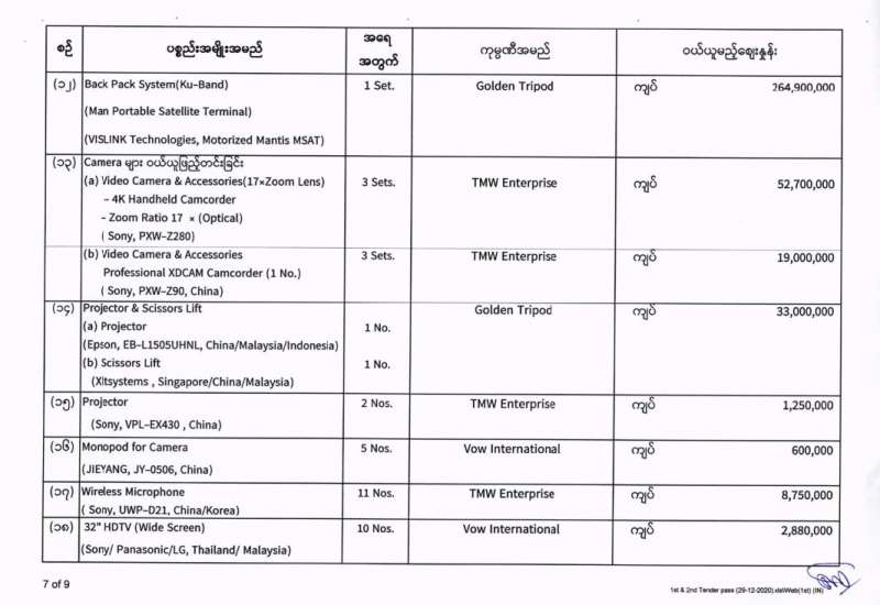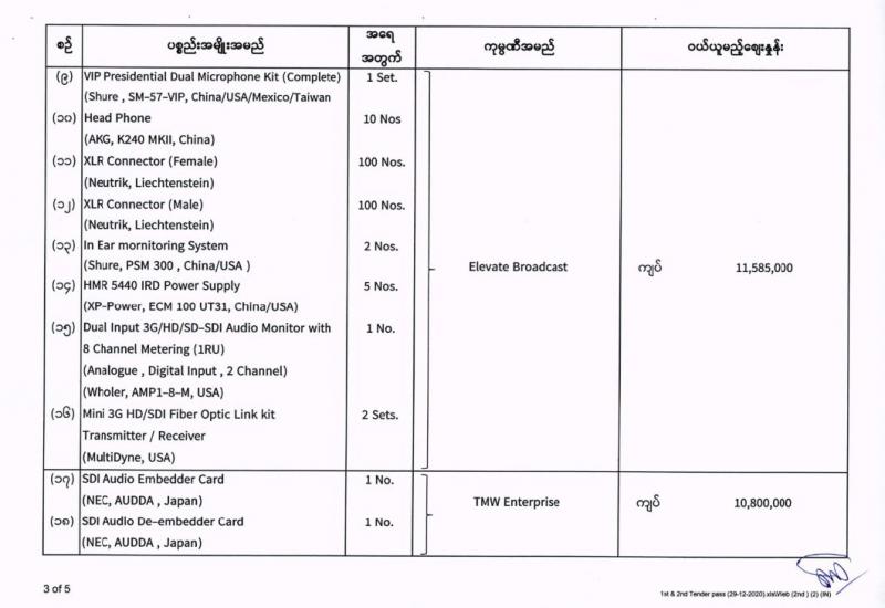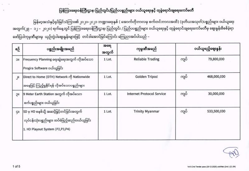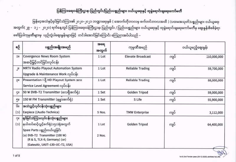 မြန်မာ့အသံနှင့်ရုပ်မြင်သံကြား၏ ၂၀၂၀-၂၀၂၁ ဘဏ္ဍာရေးနှစ် (အောက်တိုဘာလမှ စက်တင်ဘာလအထိ) (ပထမအသုတ်) ပစ္စည်းများ ဝယ်ယူရေးအတွက် (၂၉-၁၂-၂၀၂၀) ရက်နေ့တွင် ပြန်ကြားရေးဝန်ကြီးဌာန၊ ပြည်တွင်း/ပြည်ပ ပစ္စည်းများ ဝယ်ယူရေးနှင့် ထုခွဲရောင်းချရေး ကော်မတီမှ ဈေးနှုန်းစိစစ်ခဲ့ရာ ဖော်ပြပါကုမ္ပဏီများမှ ယှဉ်တွဲပါ ဈေးနှုန်းများဖြင့် တင်ဒါအောင်မြင်ကြောင်း ကြေညာအပ်ပါသည်