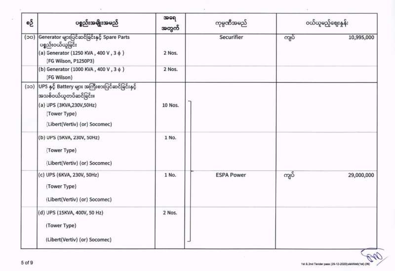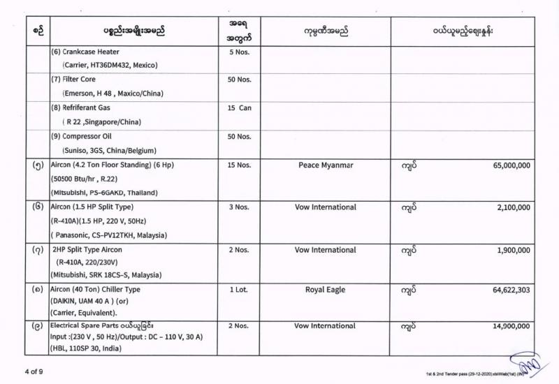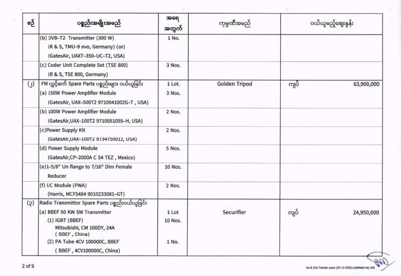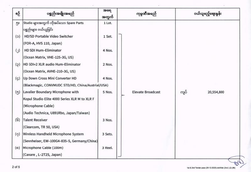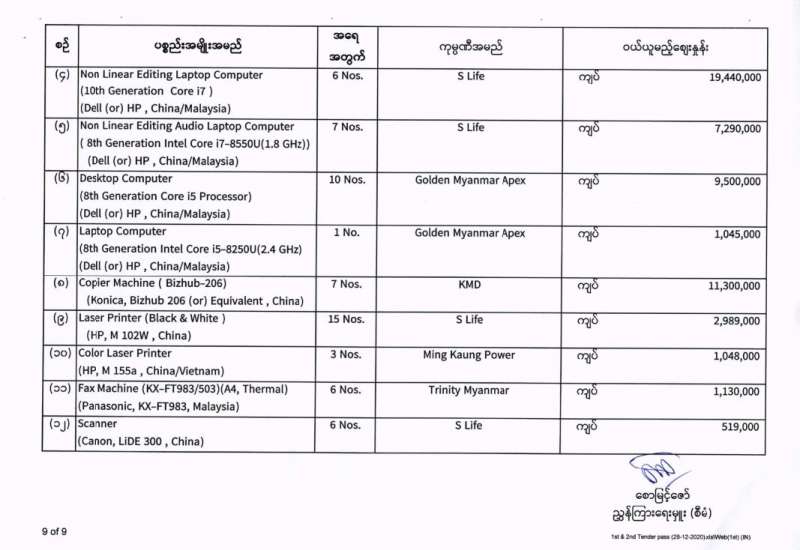 မြန်မာ့အသံနှင့်ရုပ်မြင်သံကြား၏ ၂၀၂၀-၂၀၂၁ ဘဏ္ဍာရေးနှစ် (အောက်တိုဘာလမှ စက်တင်ဘာလအထိ) (ဒုတိယအသုတ်) ပစ္စည်းများ ဝယ်ယူရေးအတွက် (၂၉-၁၂-၂၀၂၀) ရက်နေ့တွင် ပြန်ကြားရေးဝန်ကြီးဌာန၊ ပြည်တွင်း/ပြည်ပ ပစ္စည်းများ ဝယ်ယူရေးနှင့် ထုခွဲရောင်းချရေး ကော်မတီမှ ဈေးနှုန်းစိစစ်ခဲ့ရာ ဖော်ပြပါကုမ္ပဏီများမှ ယှဉ်တွဲပါ ဈေးနှုန်းများဖြင့် တင်ဒါအောင်မြင်ကြောင်း ကြေညာအပ်ပါသည်-