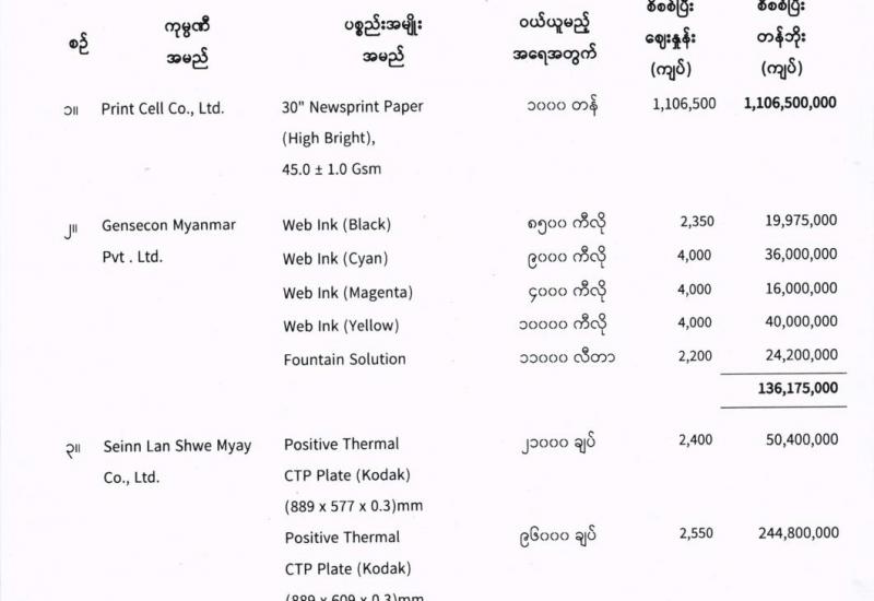 ပြန်ကြားရေးဝန်ကြီးဌာန ပြည်တွင်း/ ပြည်ပ ပစ္စည်းများ ဝယ်ယူရေးနှင့် ထုခွဲရောင်းချရေးကော်မတီ တင်ဒါအောင်မြင်ကြောင်း ကြေညာခြင်း