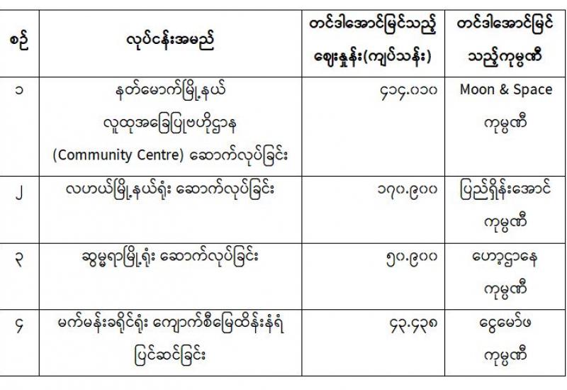 ပြန်ကြားရေးဝန်ကြီးဌာန၊ ပြန်ကြားရေးနှင့်ပြည်သူ့ဆက်ဆံရေးဦးစီးဌာန၊ ၂၀၂၀-၂၀၂၁ ဘဏ္ဍာရေးနှစ် အတွင်း အောက်ဖော်ပြပါ လူထုအခြေပြုဗဟိုဌာန (Community Centre) နှင့် ရုံးအဆောက်အအုံများ ဆောက်လုပ်ခြင်း၊ မြေထိန်းနံရံ ပြင်ဆင်ခြင်းတို့အတွက် ပြည်ထောင်စုအစိုးရအဖွဲ့ရုံး၏ ညွှန်ကြားချက်နှင့် အညီ သက်ဆိုင်ရာ တိုင်းဒေသကြီး/ ပြည်နယ်အစိုးရအဖွဲ့များ ကြီးကြပ်ကွပ်ကဲမှုဖြင့် တင်ဒါခေါ်ယူဆောင်ရွက်ခဲ့ရာ ယှဉ်တွဲပါကုမ္ပဏီများက အိတ်ဖွင့်တင်ဒါ အောင်မြင်ကြောင်း ကြေညာအပ်ပါသည်-