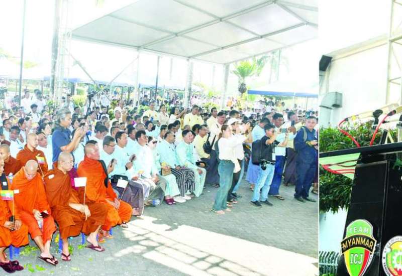 ပြည်ထောင်စုသမ္မတမြန်မာနိုင်ငံတော်၏ ဂုဏ်သိက္ခာနှင့် တရားမျှတသော အမှန်တရားအတွက် နယ်သာလန်နိုင်ငံ သည်ဟိဂ်မြို့ အပြည်ပြည်ဆိုင်ရာတရားရုံး (ICJ) ၌ တုံ့ပြန်ချေပလျှောက်လဲခဲ့သည့် မြန်မာကိုယ်စားလှယ်အဖွဲ့သည် ဇန်နဝါရီ ၃၁ ရက်တွင် နယ်သာလန်နိုင်ငံမှ ပြန်လည်ထွက်ခွာလာရာ ယနေ့နံနက်ပိုင်းတွင် ရန်ကုန်အပြည်ပြည်ဆိုင်ရာလေဆိပ်သို့ ပြန်လည်ရောက်ရှိပြီး ရန်ကုန်တိုင်းဒေသကြီး ဝန်ကြီးချုပ် ဦးစိုးသိန်း၊ တိုင်းဒေသကြီးဝန်ကြီးများ၊ ဌာနဆိုင်ရာဝန်ထမ်းများ၊ အရပ်ဘက်အဖွဲ့အစည်းများ၊ ရဟန်းရှင်လူပြည်သူများ၊ အနုပညာရှင်များ၊ ကျောင်းသား ကျောင်းသူများက ဂုဏ်ပြုပန်းစည်းများပေးအပ်၍ ကြိုဆိုထောက်ခံကြောင်း ဗီနိုင်းပိုစတာများ ကိုင်ဆောင်ကာ နိုင်ငံတော်အလံများ ဝှေ့ယမ်းပြီး လှိုက်လှိုက်လှဲလှဲ တစ်ခဲနက်ကြိုဆိုကြသည်။
