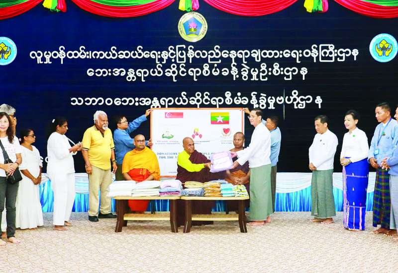 ရေဘေးဒဏ်ခံစားရသောဒေသများအတွက် စင်ကာပူနိုင်ငံ Ma-hakaruna Buddhist Society ၊ Singapore Sinhala Buddhist Association နှင့် Willing Hearts Foundation တို့က အစားအစာ၊ အဝတ်အထည်နှင့် စာရေးကိရိယာများလွှဲပြောင်းပေးအပ်လှူဒါန်းပွဲ အခမ်းအနားကို ယနေ့နံနက်ပိုင်းက လူမှုဝန်ထမ်း၊ ကယ်ဆယ်ရေးနှင့် ပြန်လည်နေရာချထားရေးဝန်ကြီးဌာန သဘာဝဘေးအန္တရာယ်ဆိုင်ရာစီမံခန့်ခွဲမှုဗဟိုဌာန (DMC) ၌ကျင်းပရာ ဒုတိယဝန်ကြီး ဦးစိုးကြည်ကလက်ခံရယူပြီး ကျေးဇူးတင်စကားပြောကြားကာ ဂုဏ်ပြုမှတ်တမ်းလွှာများ ပြန်လည်ပေးအပ်သည်။