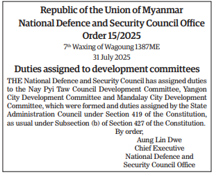 Republic of the Union of Myanmar National Defence and Security Council Office Order 15/2025