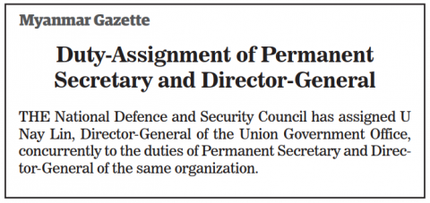 THE National Defence and Security Council has assigned U Nay Lin, Director-General of the Union Government Office, concurrently to the duties of Permanent Secretary and Director-General of the same organization.
