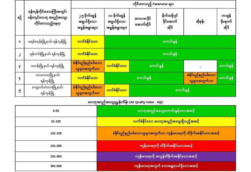 Air quality monitoring conducted on 6 March in Yangon shows that pollution in Bahan, Thakayta and Kyauktada townships has reached levels that may affect sensitive groups, according to a statement released by the Ministry of Natural Resources and Environmental Conservation on 7 March.