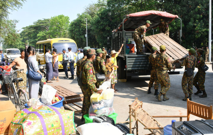 Similarly, in the Nay Pyi Taw Council area, the staff housings in the townships were damaged by the earthquake. The staff families living in these houses are being quickly relocated to safe places and temporary residences with the plans of their respective Ministries by the help of military vehicles and military personnel. Arrangements are also being made to ensure that the staff can eat, and sleep, having purified drinking water and water for use in these places.