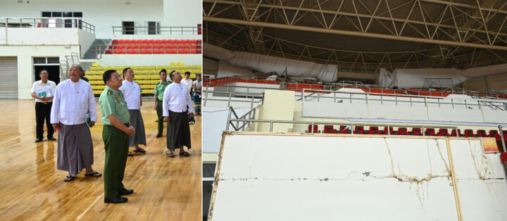 Chairman of the State Administration Council Prime Minister Senior General Min Aung Hlaing, accompanied by Council Joint Secretary General Ye Win Oo and officials, yesterday afternoon inspected the loss and damage at sports buildings of Wunna Theikdi Sports Complex caused by the Mandalay earthquake in Nay Pyi Taw.